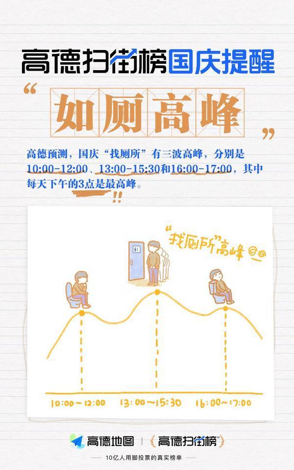 高德預測,十一“找廁所”有三波高峯,分別是10:00-12:00、13:00-15:30和16:00-17:00,其中每天下午15點是最高峯。