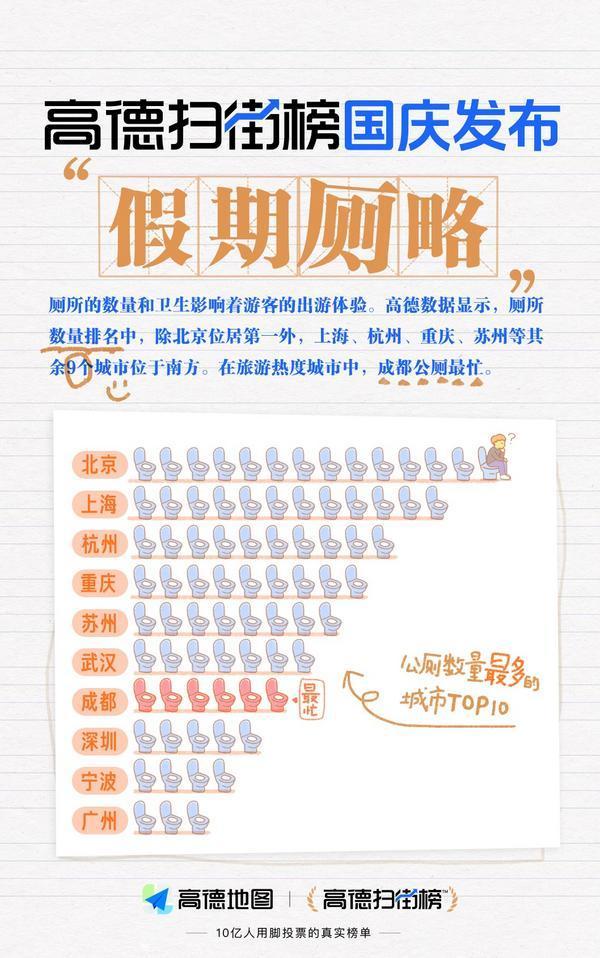 10月2日,高德掃街榜發佈全國城市公廁數量榜與密度榜、母嬰室友好城市榜。從分佈看,公共廁所及母嬰室,都呈現南多北少、南密北疏特點。北京公廁數量第一,深圳公廁和母嬰室密度都最高,成都的公廁最繁忙。