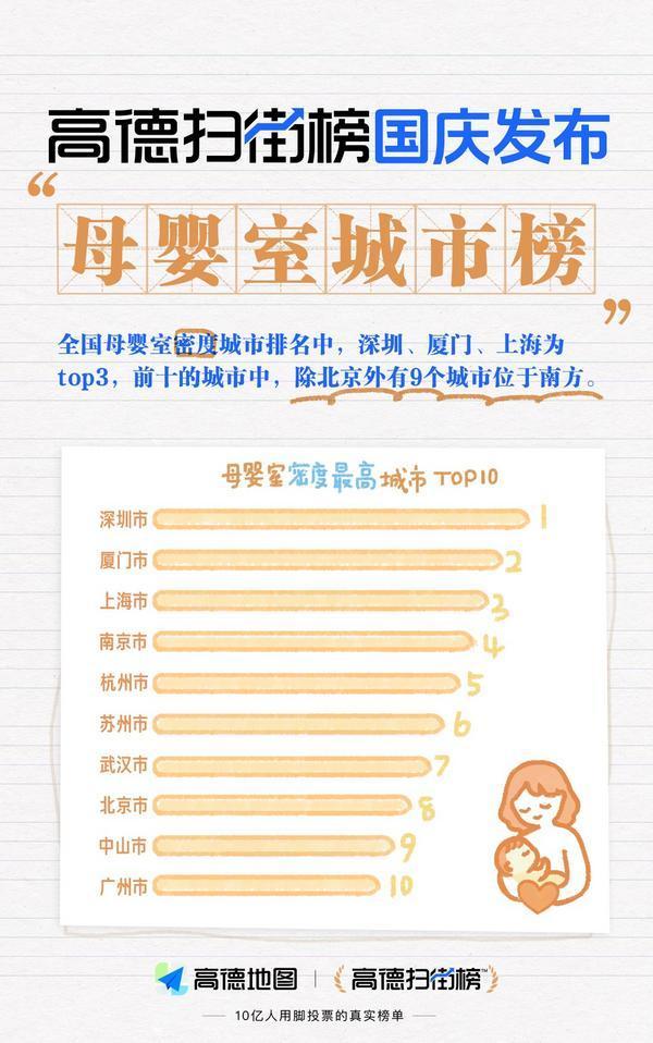 從全國城市母嬰室分佈看,深圳、廈門、上海的密度為前三,前十的城市中,除北京外有9個城市位於南方。去年十一黃金週,搜索母嬰室次數最高的城市分別是杭州、北京、深圳、蘇州、上海。