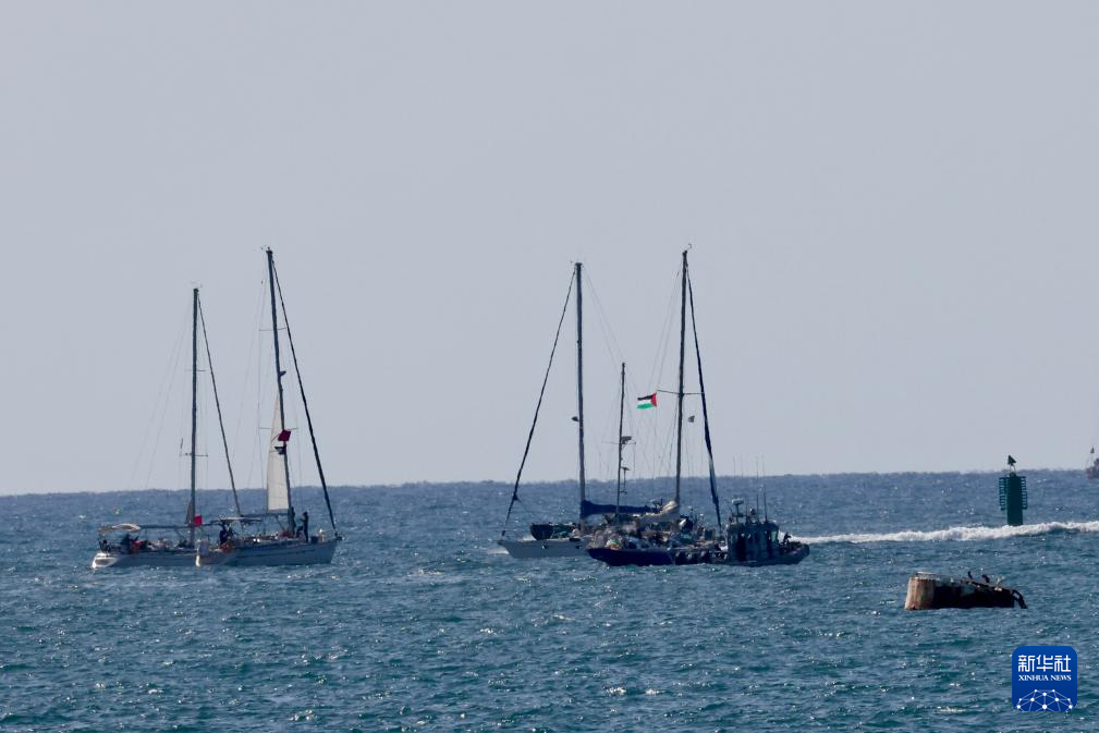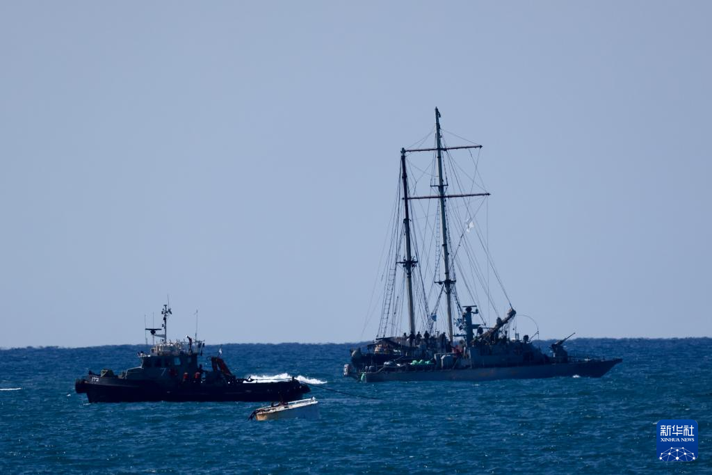 10月2日,在以色列南部阿什杜德港附近,“全球堅韌船隊”船隻被拖向港口。新華社發(賈馬爾·阿瓦德攝)