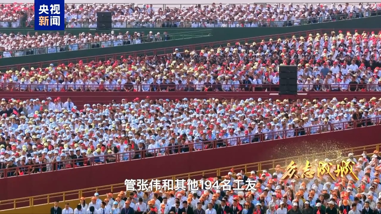 9月3日當天,管張偉和其他194名工友作為8900多名廣場設施建設施工人員代表,坐上了他們自己搭建的廣場觀禮台,觀禮紀念大會和盛大閲兵式。