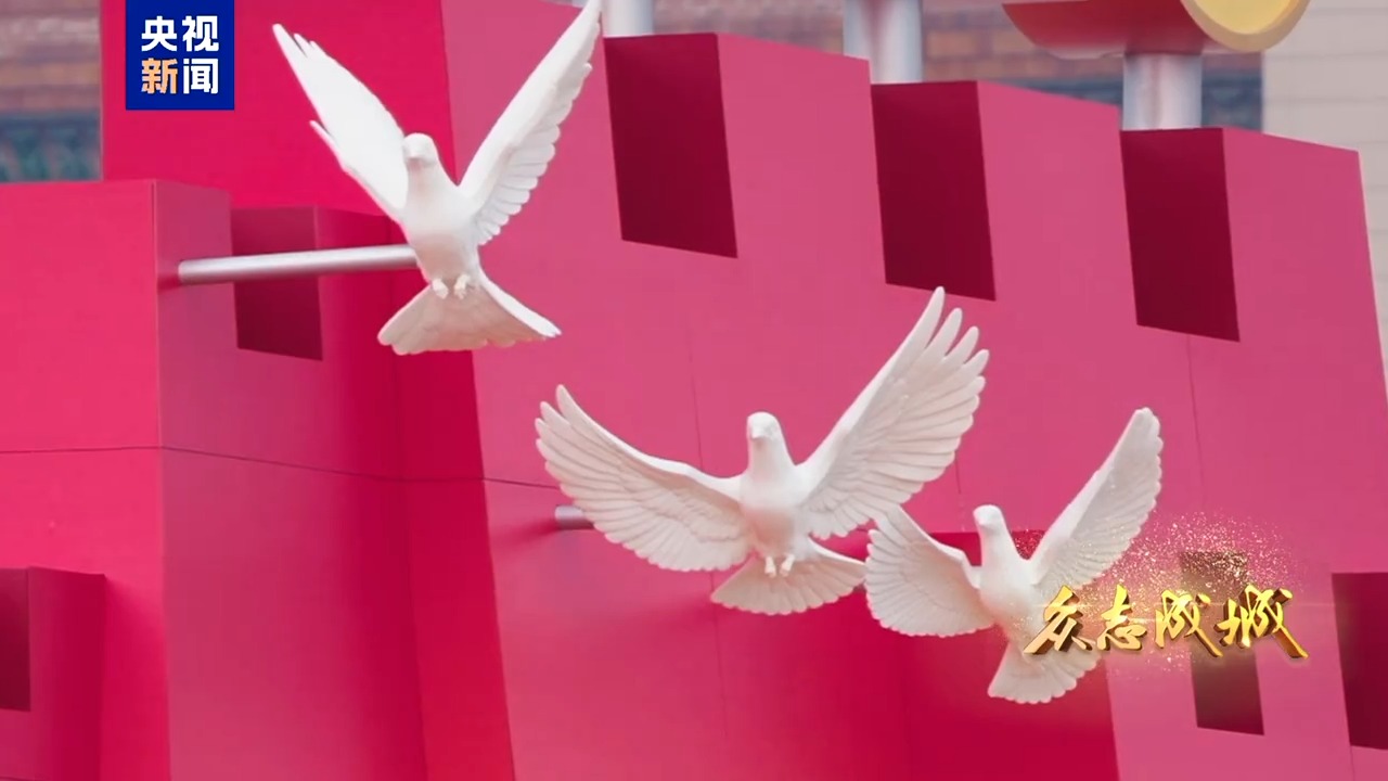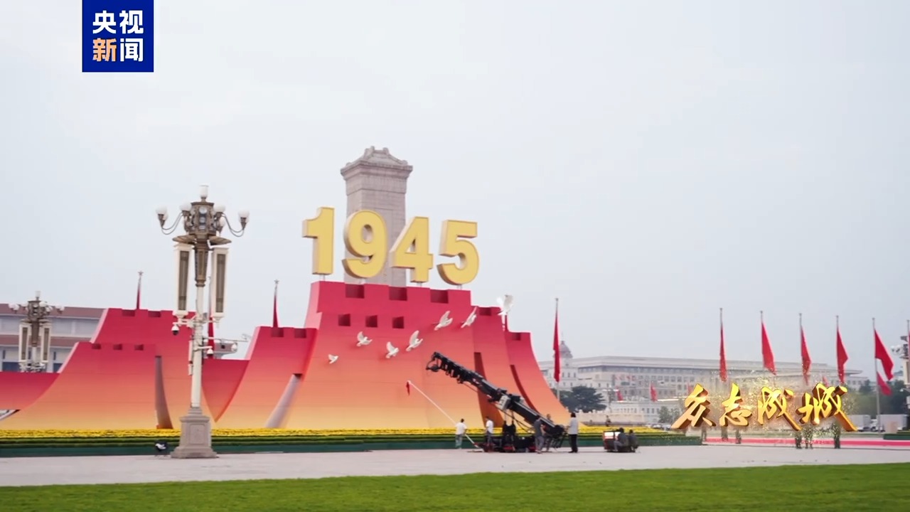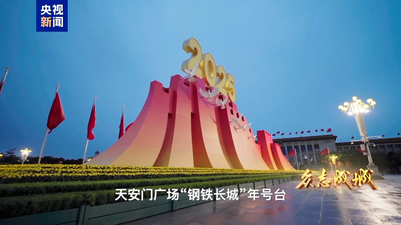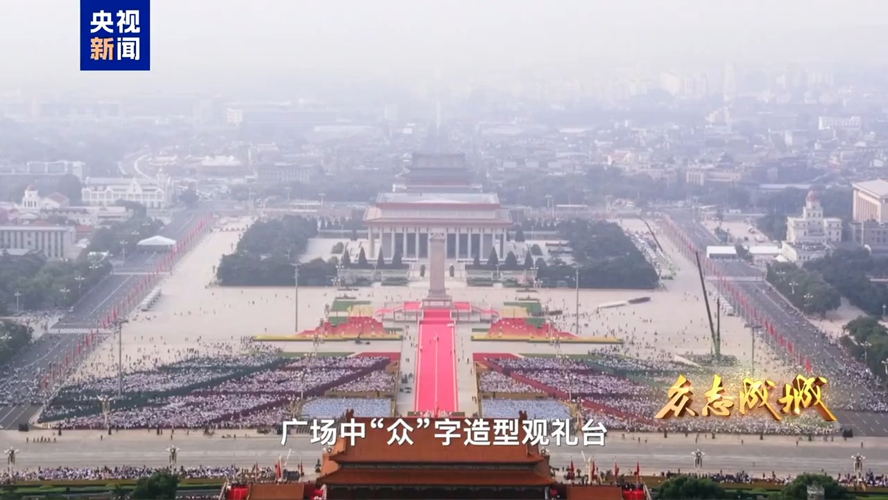 9月3日,首都北京,旌旗飄揚。天安門城樓莊嚴雄偉,天安門廣場氣象恢宏。人民英雄紀念碑前,“鋼鐵長城”主題景觀巍然矗立,14座烽燧託舉起“1945”“2025”字樣,14只“和平鴿”振翅飛翔,寓意着十四載浴血奮戰、八十年精神傳承。從空中俯瞰,廣場中“眾”字造型觀禮台蔚為壯觀,象徵着在中國共產黨領導下中國人民萬眾一心、眾志成城,向着中華民族偉大復興昂揚奮進。