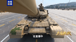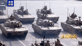 長安街上預埋遙控的攝像機和仰拍鏡頭讓戰車如鋼鐵洪流迎面而來,勢不可擋。