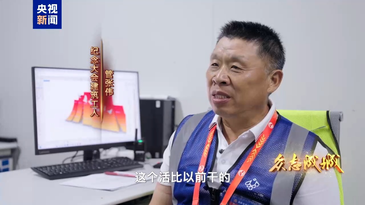 建築工人管張偉,今年56歲,這已經是他第三次參加北京天安門廣場重大活動的裝置搭建任務。2019年,新中國成立70週年慶典,他拼裝過“紅飄帶”的弧度;2021年建黨百年慶典,他組裝過年號台的“彩虹橋”。可這次他總説“心裏發緊”,生怕辜負了這份特殊的重量。