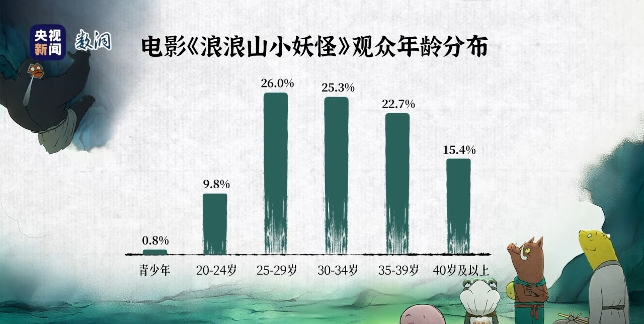 根據網絡平台的數據,今年暑期檔中,國產動畫電影《浪浪山小妖怪》的觀眾中,25到29歲的年輕人佔比最高,達到26%。他們中很多不是陪孩子來看的爸媽,而是自己真心想看的核心觀眾。