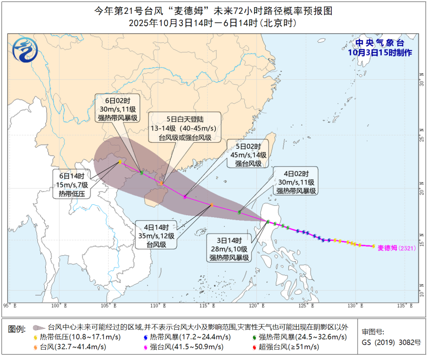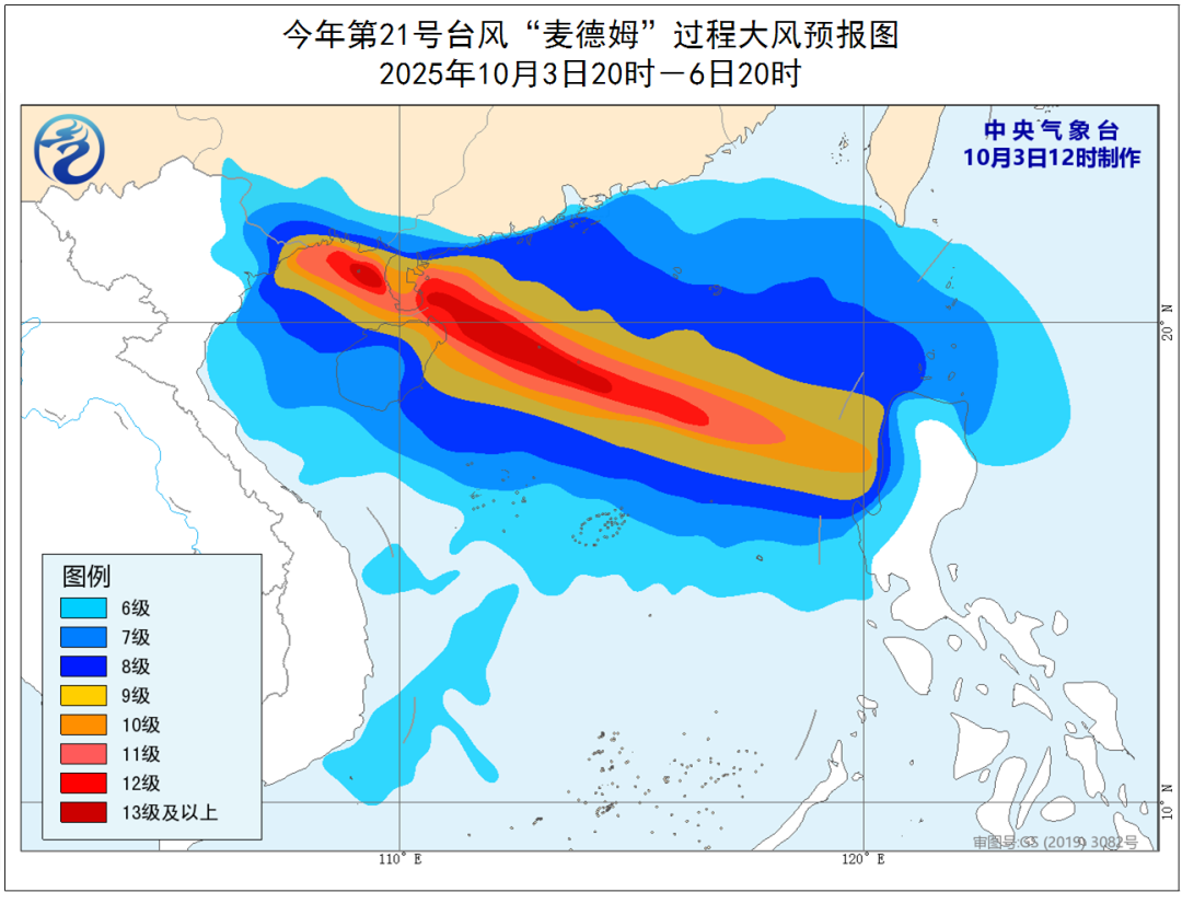 *大風預報:*3日夜間至6日白天,廣東雷州半島和中西部沿海、廣西沿海、海南島及沿海、西沙羣島、中沙羣島、黃巖島附近海域將有6~8級風,南海中北部、瓊州海峽、北部灣中北部有9~11級風,“麥德姆”中心經過的附近海域或地區風力可達12~14級、陣風15~17級。