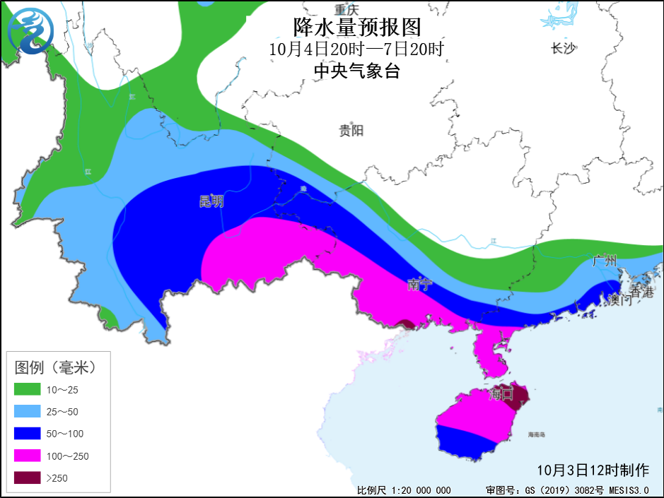 *降雨預報:*4日夜間至7日白天,華南南部和西部、雲南等地自東向西有大到暴雨;其中,海南島中北部、廣東西南部、廣西南部、雲南東南部部分地區有大暴雨,海南島東北部和廣西沿海局地特大暴雨(累計降雨量100~160毫米,局地250~280毫米)。主要降雨時段廣東、海南4日夜間至5日,廣西5日至6日,雲南6日至7日。