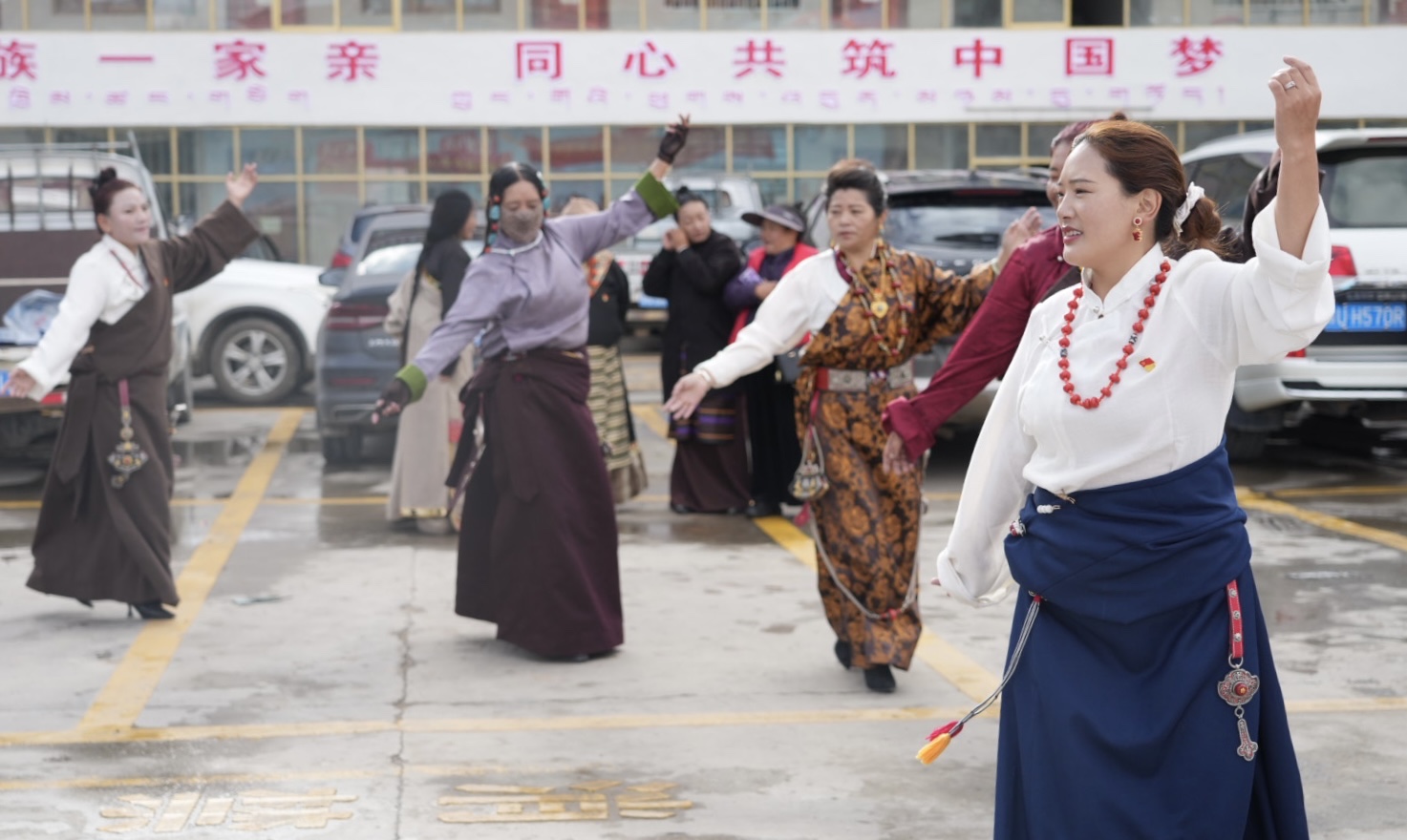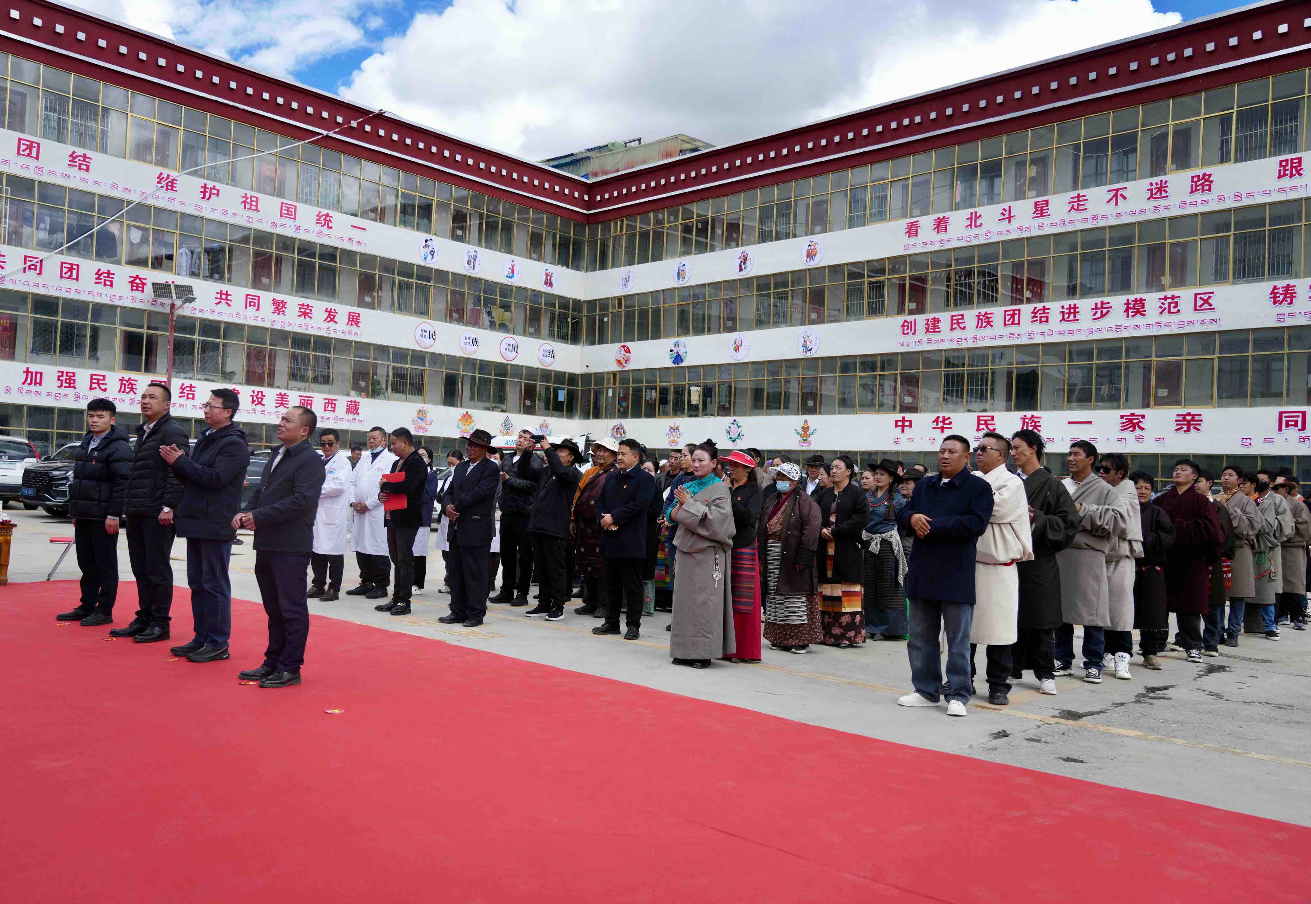 升旗儀式即將開始,各族居民陸續來到大院中央,男女老少,身着各色民族服裝,臉上洋溢着同樣的期待與莊嚴。國歌響起,眾人凝視國旗緩緩升起,在高原的藍天與朝陽映襯下,那抹紅色格外鮮豔。