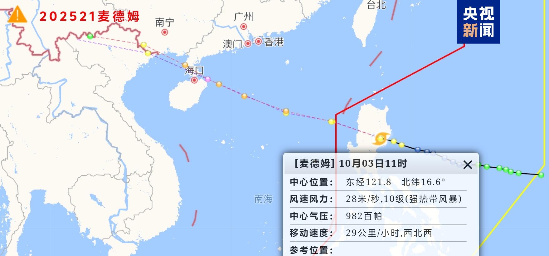 “麥德姆”加強為強熱帶風暴級 海南發佈颱風四級預警(海上)