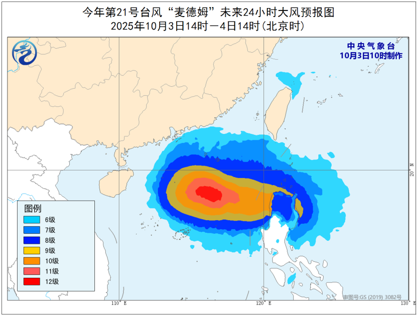 大風預報:3日14時至4日14時,巴士海峽、南海北部和中部海域、黃巖島附近海域將有6-9級、陣風10-11級的大風,“麥德姆”中心經過的附近海域風力可達10-12級,陣風13-14級。