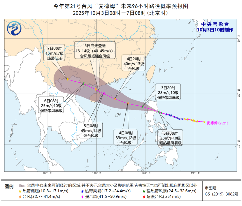 預計,“麥德姆”將以每小時30公里左右的速度向西偏北方向移動,將於今天白天穿過菲律賓呂宋島,之後移入南海東部海面,逐漸向廣東西部到海南島東部一帶沿海靠近,強度逐漸增強,最強可達強颱風級(14-15級,42-48米/秒),將於5日白天在上述沿海登陸(颱風級或強颱風級,13-14級,40-45米/秒),登陸後強度逐漸減弱。