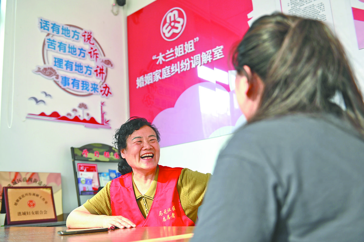安徽亳州市譙城區薛閣街道馬元社區“木蘭姐姐”婚姻家庭糾紛調解室裏,黨員志願者在參與調解。張洪金攝(人民視覺)