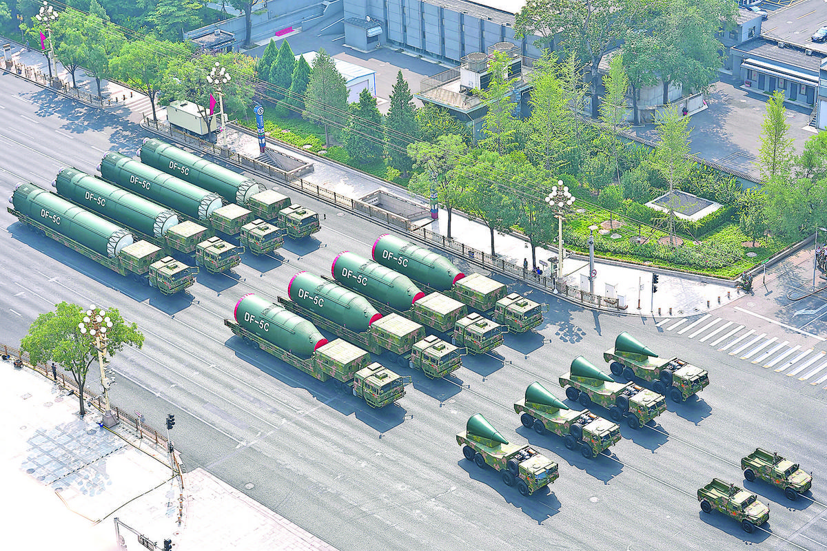 紀念中國人民抗日戰爭暨世界反法西斯戰爭勝利80週年大會上,核導彈第二方隊接受檢閲。新華社記者 胥冰潔攝