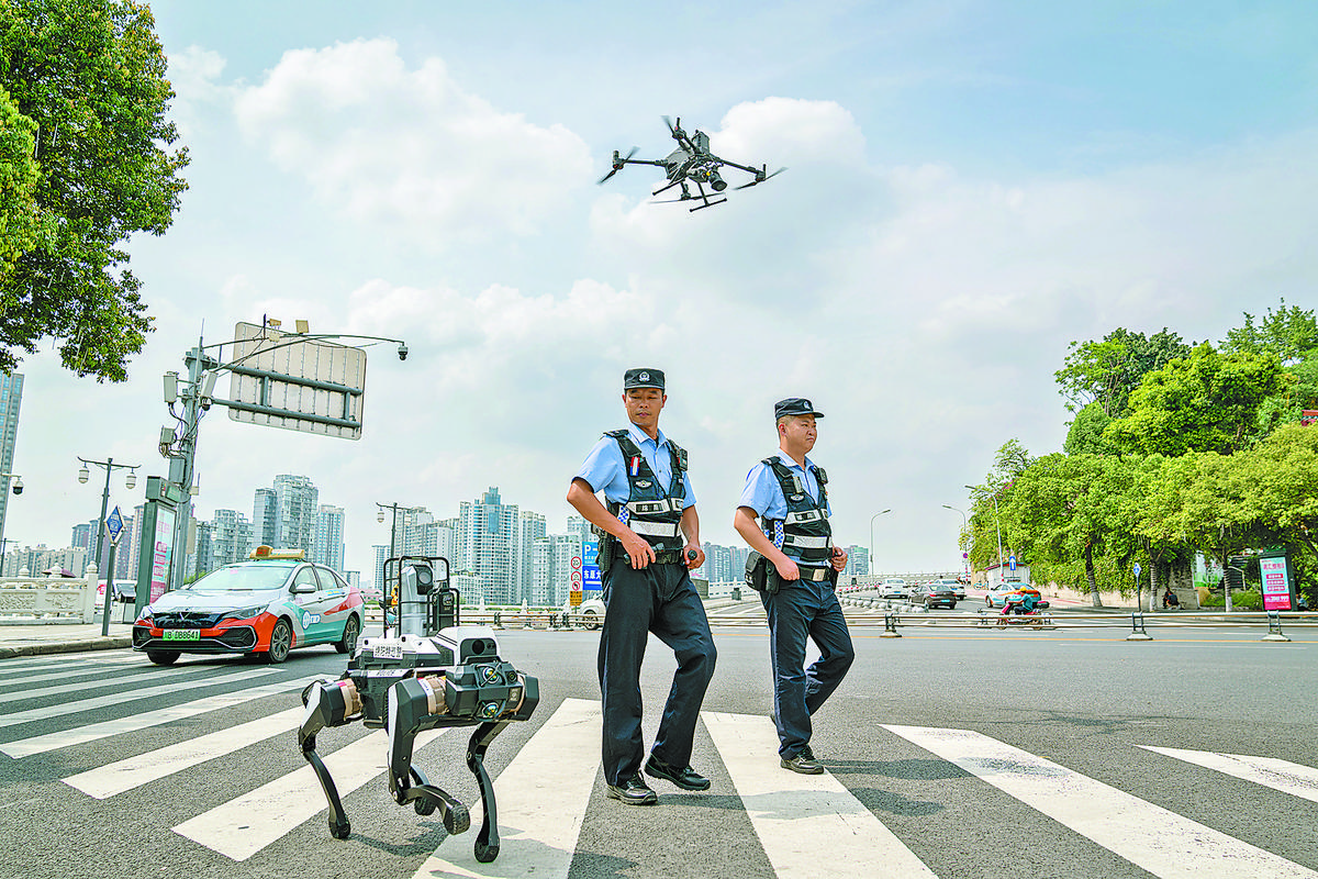 四川綿陽市公安局特巡警支隊民警利用警用機器狗與空中巡邏無人機進行巡邏防控。唐 超攝(影像中國)