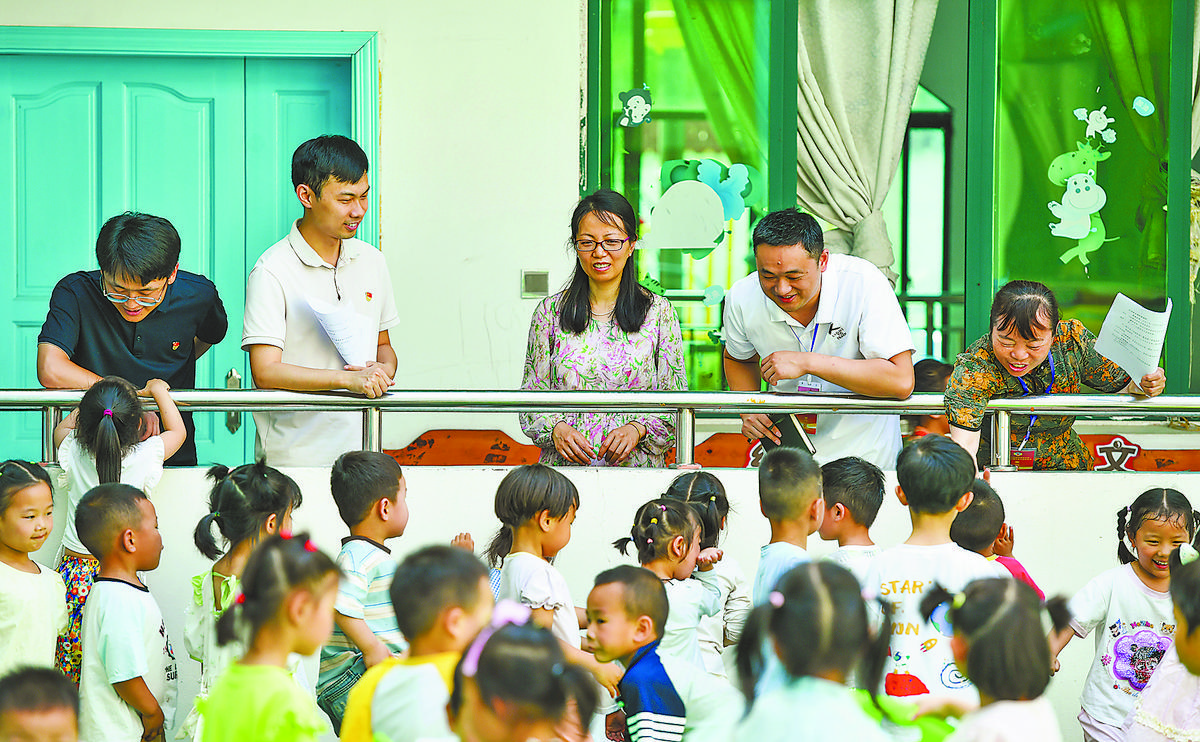 江西豐城市梅林鎮的黨員幹部和政協委員就“一老一小”民生服務保障情況在梅林鎮中心幼兒園走訪調研。周 亮攝(人民視覺)