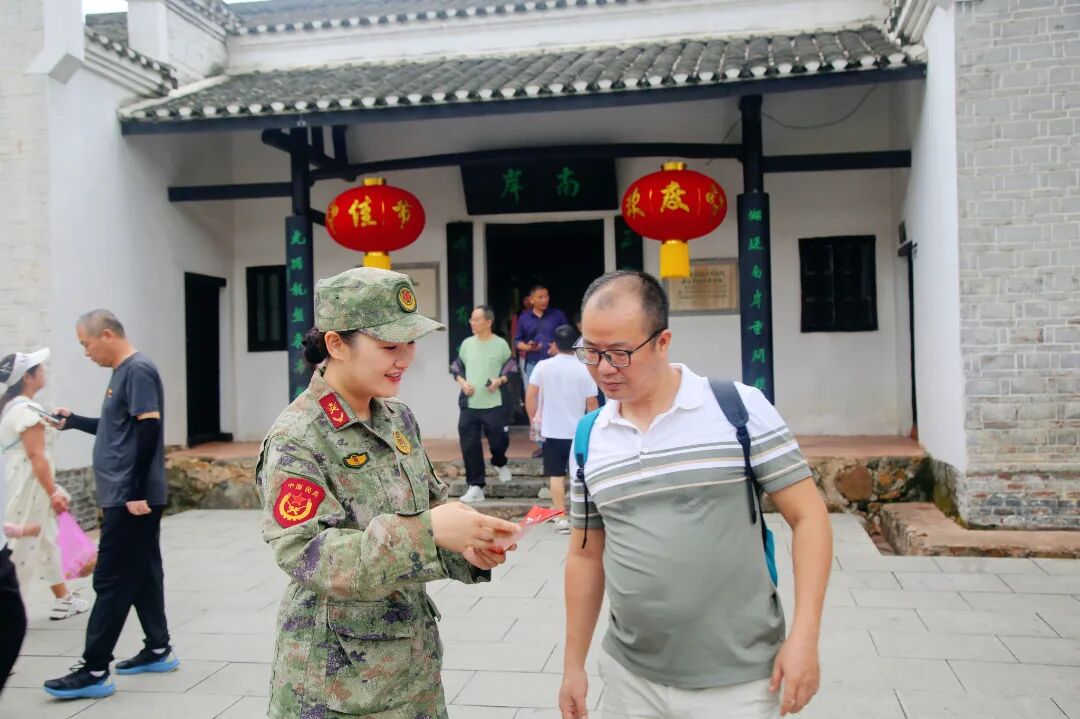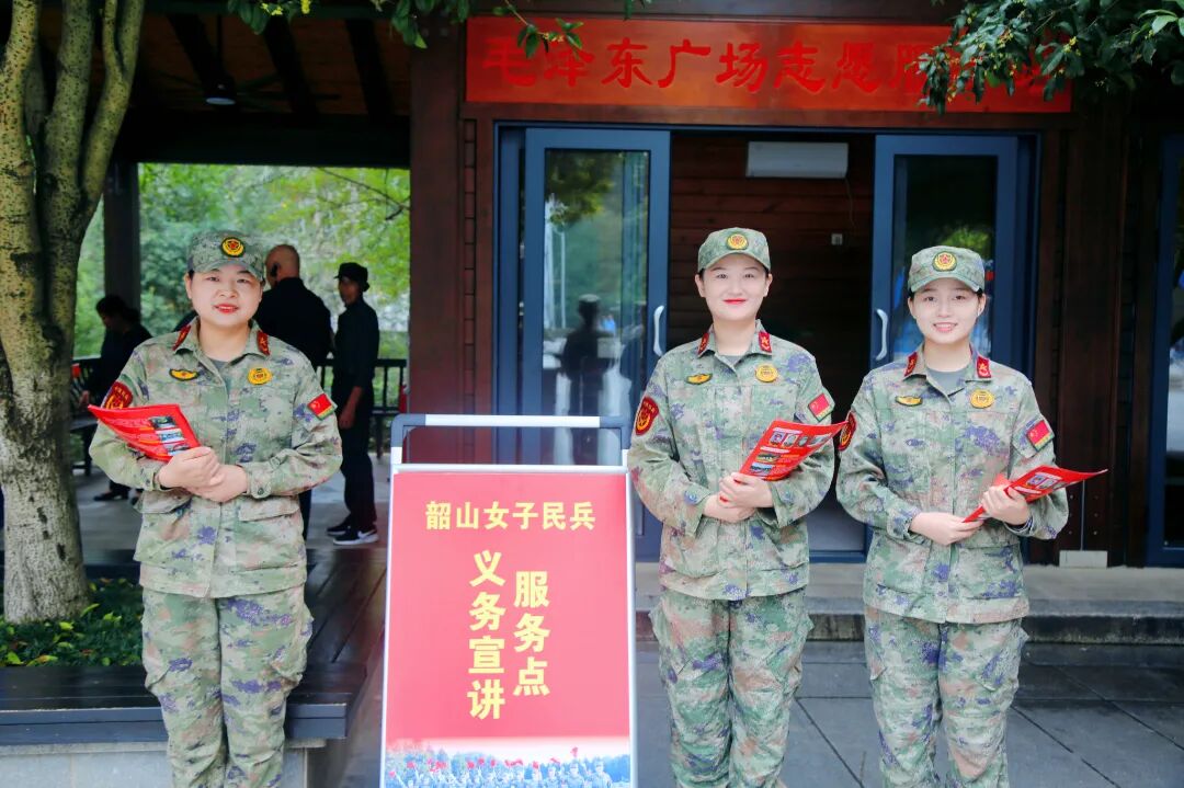 身着迷彩服的韶山女子民兵宣講隊隊員們整齊列隊,在廣場及毛澤東同志故居周邊,開展“國慶迎華誕、宣講暖人心”主題活動。她們將鮮紅的小國旗傳遞給往來遊客,一面面鮮豔的國旗在遊客手中揮舞,構成了節日裏最動人的“中國紅”與“國防綠”交響曲。(沈優、謝利民)