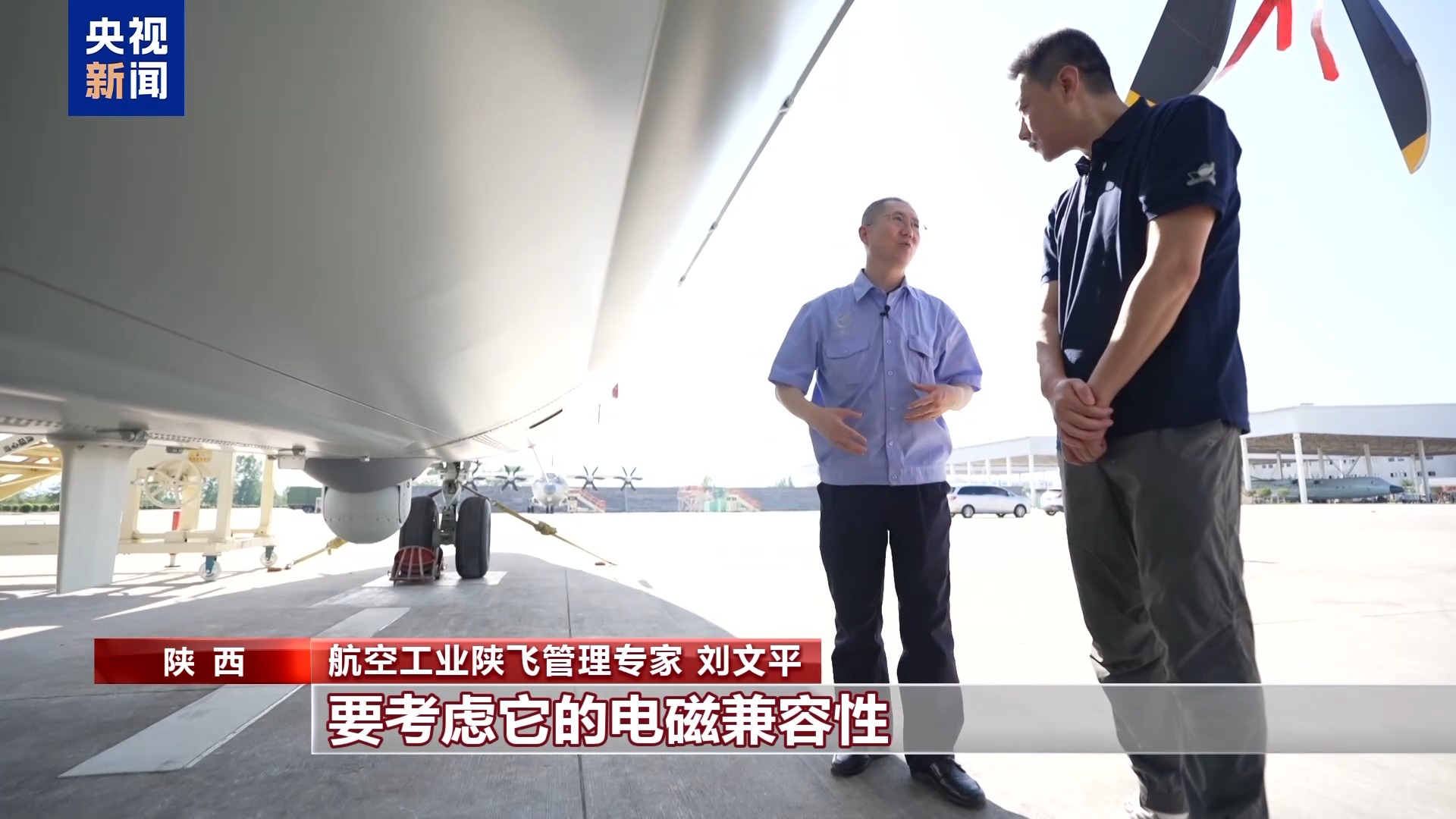 *航空工業陝飛管理專家 劉文平:*它要接近戰場,跑道更加惡劣一些。我們的軍機大部分採用的都是上單翼,保證我們能適應戰場的野戰生存能力。我們需要它對目標的預警探測,同時對戰場的一些監控,還有我探測到的一些信息態勢的捕捉和分發。在我的體系裏面實現作戰的效能最大化發揮。