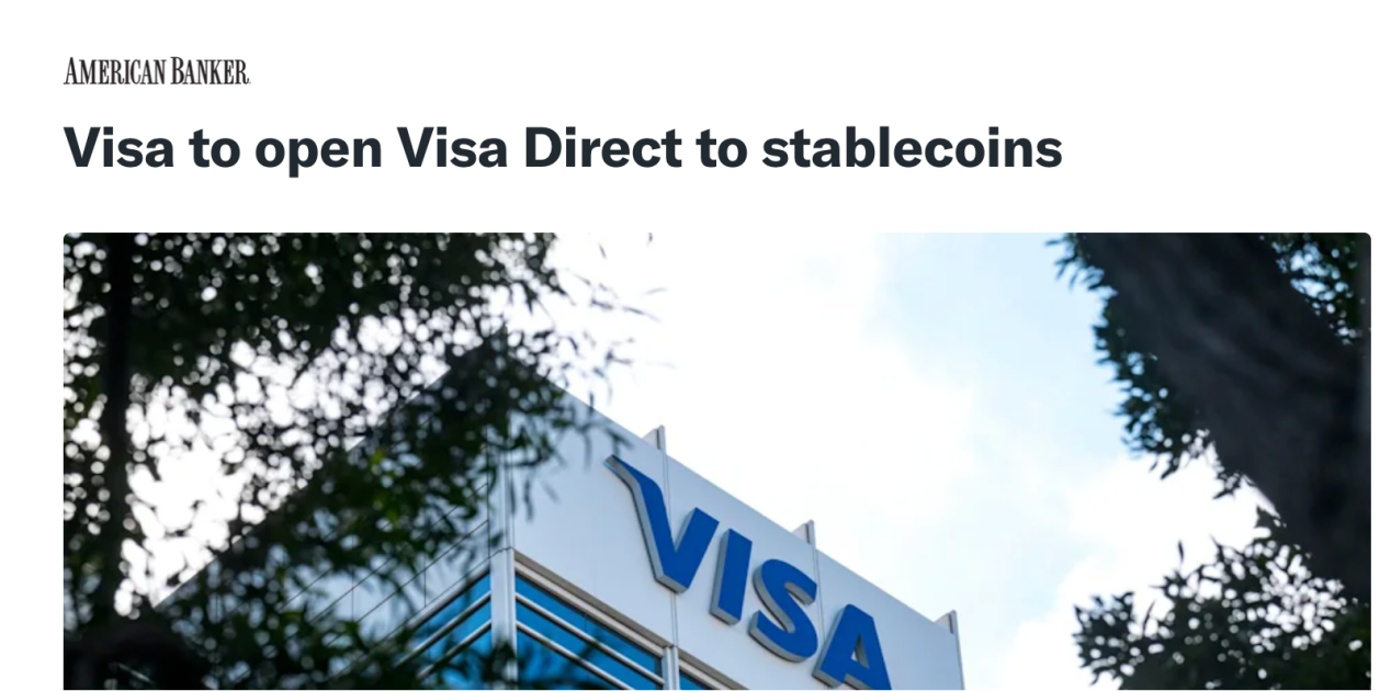 Visa正在將其即時跨境支付網絡Visa Direct向穩定幣預融資試點開放。這一舉措將允許企業在不同國家間即時轉賬,即使是在銀行非營業時間也可完成。