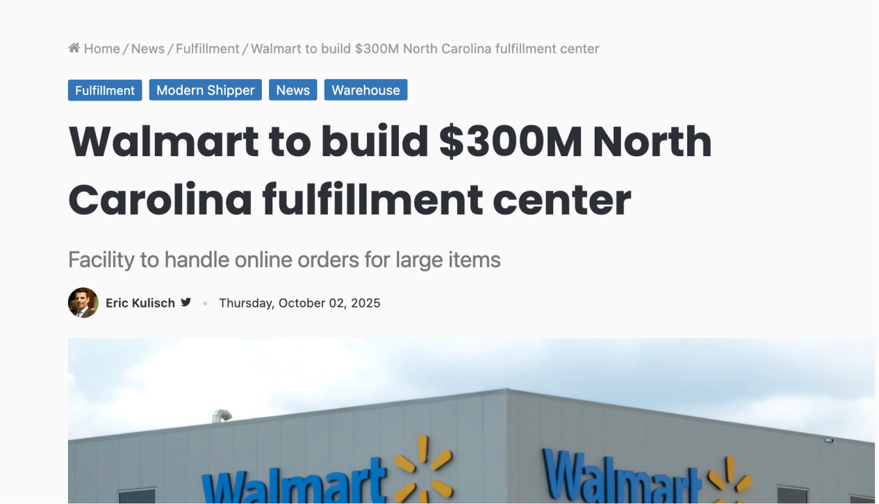 目前,沃爾瑪在北卡羅來納州共擁有超過214家沃爾瑪門店及山姆會員店,並設有七個配送中心。新建的配送中心預計將創造300個就業崗位。