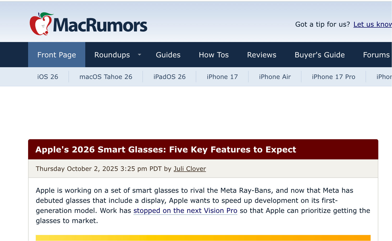 【環球網科技綜合報道】據海外科技媒體MacRumors透露,蘋果正加速研發一款智能眼鏡,旨在與Meta的雷朋系列展開競爭。面對Meta已推出帶顯示屏的智能眼鏡,蘋果希望加快其首代產品的開發進程,甚至已暫停下一代Vision Pro的部分工作,以優先推進眼鏡產品上市。