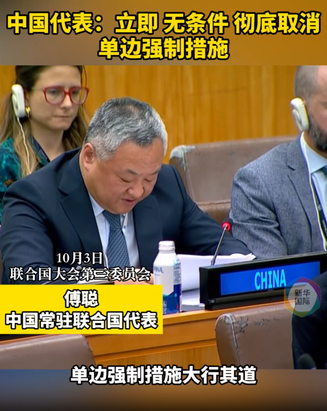中國常駐聯合國代表傅聰3日代表觀點相近國家在聯大第三委員會就單邊強制措施作共同發言時表示,在聯合國成立80週年之際,國際社會必須保持清醒,加強團結合作,堅決遏止這一非法行徑。