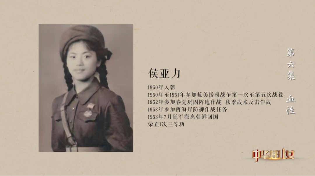 侯亞力14歲就加入新四軍,參加過抗日戰爭。1950年,她隨志願軍第40軍首批入朝,在朝鮮戰場屢次遇險,卻憑着血性膽氣打滿全程。