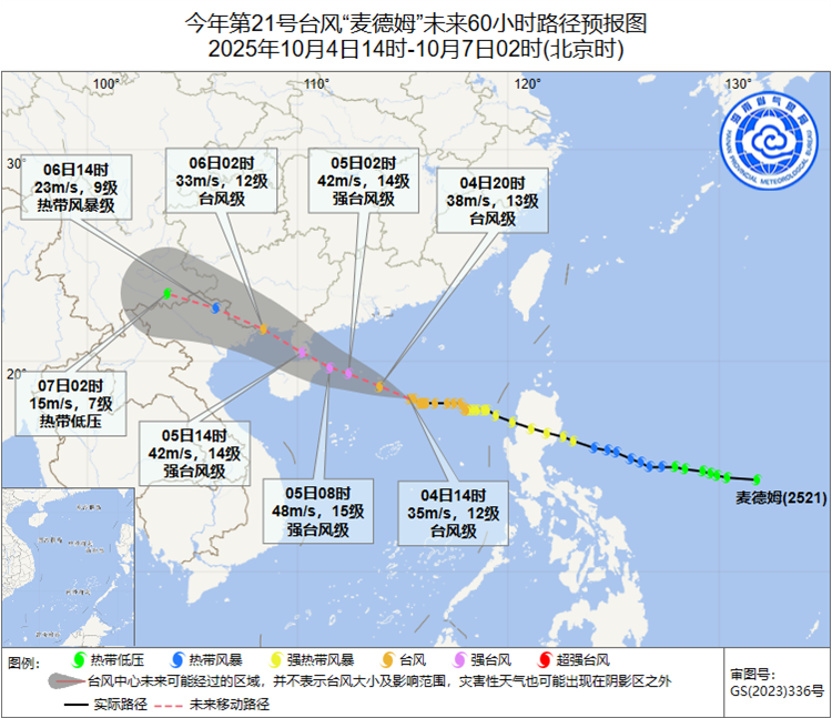 颱風“麥德姆”將於5日上午在文昌登陸或近海擦過(颱風級或強颱風級,13~14級,40~45米/秒)。