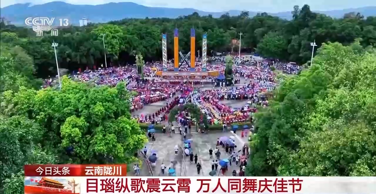 國慶期間,身着節日盛裝的雲南隴川各族羣眾與五湖四海的賓朋歡聚一堂,同唱一首歌,共跳一支舞,歡度假期。伴隨着鏗鏘的鼓點,身着節日盛裝的隴川各族兒女與四方賓朋,踩着同一節拍,以螺旋形的隊伍緩緩進入目瑙縱歌場。頃刻間,鏗鏘的鼓點、渾厚的鋩鑼聲與激昂的樂聲交織迸發,瞬間點燃了現場的激情。不過片刻,現場已化為一片歡騰的海洋。