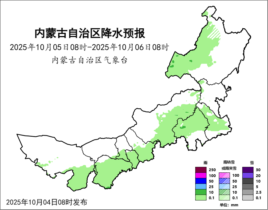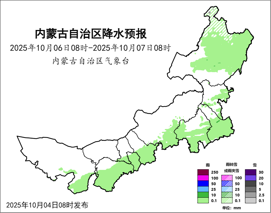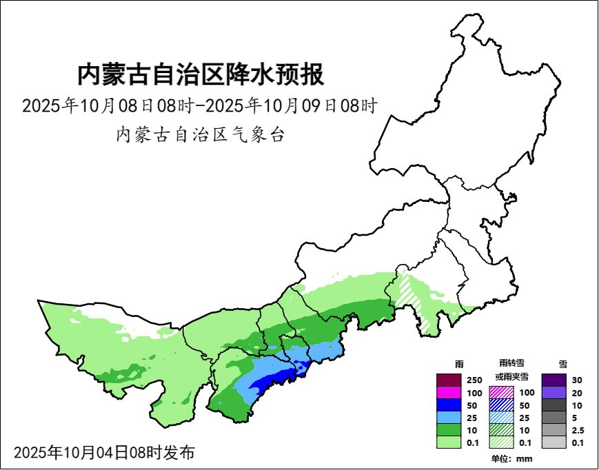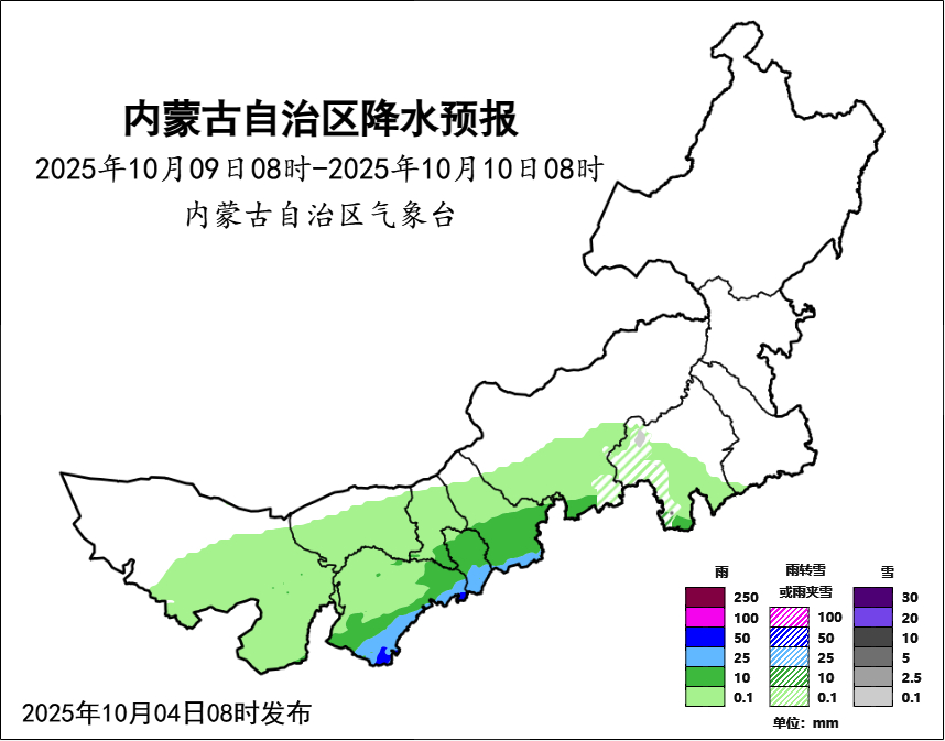 降水方面,未來三天,我區降水主要集中在南部和東部,有小雨或雨夾雪,其中,鄂爾多斯市東南部、錫林郭勒盟東部、赤峯市西北部、呼倫貝爾市西南部部分地區有中雨。7日以後,我區降雨進入集中期,特別是8日,雨帶將跨西東部橫向發展,阿拉善盟南部、巴彥淖爾市東南部、鄂爾多斯市大部、包頭市中部和南部、呼和浩特市、烏蘭察布市中部和南部、錫林郭勒盟南部有中到大雨,鄂爾多斯市東北部、呼和浩特市南部有暴雨;9日,降雨持續,鄂爾多斯市東部和南部、包頭市南部、呼和浩特市大部、烏蘭察布市南部、錫林郭勒盟南部、赤峯市南部有中雨,鄂爾多斯市東部、呼和浩特市南部、烏蘭察布市南部有大到暴雨;10日以後,全區降水逐漸減弱。