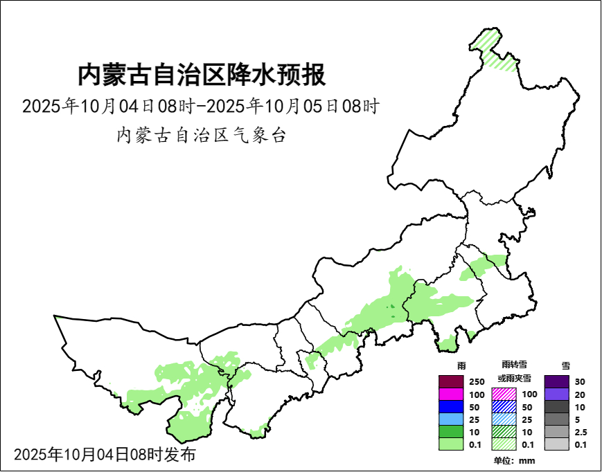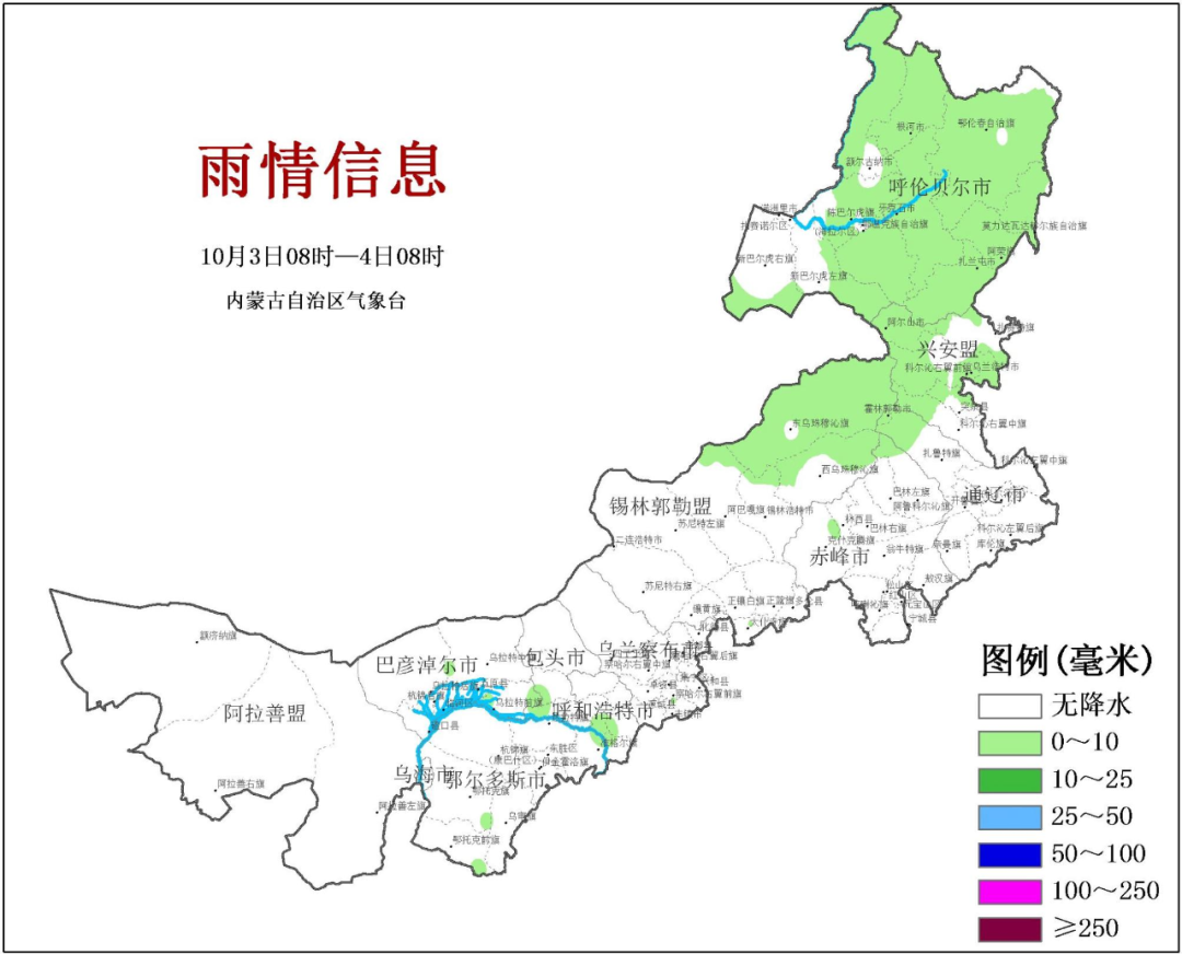 昨天,內蒙古大部都是晴到多雲的天氣,全區降水不多,只在東部地區出現一些小雨。據監測顯示,03日08時-04日08時,全區4個盟市20個旗縣的114個站點出現降水,降水主要出現在興安盟、錫林郭勒盟、呼倫貝爾市。共20個旗縣114個站出現小雨(0.1~10.0毫米),其中,興安盟阿爾山市4.3毫米、天池鎮金江溝4.1毫米、伊爾施3.7毫米。