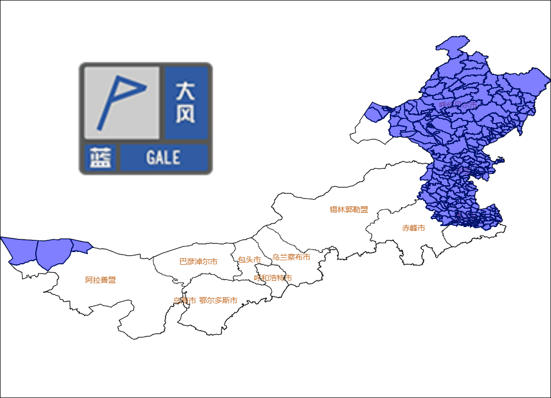 同時,未來幾天,全區風力逐漸增大,今天,西部偏西北、東部偏北地區有4、5級短時6、7級西北風或偏西風,內蒙古自治區氣象台已於今天上午發佈了大風藍色預警信號。主要大風時段集中在10月6日至8日,我區中西部偏北、中部偏東、東部大部地區4、5級短時6、7級西北風或偏西風,錫林郭勒盟東北部、赤峯市東北部、通遼市西北部、興安盟、呼倫貝爾市南部和中部陣風可達8、9級。