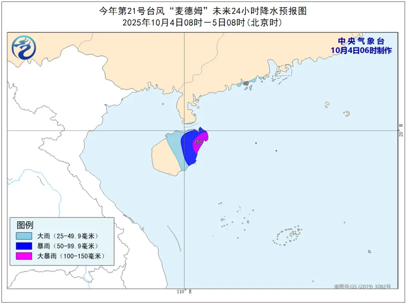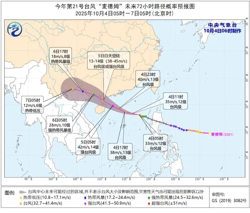 大風預報: 4日8時至5日8時,南海西北部海域、瓊州海峽、廣東西部沿海、海南島東部和北部沿海的風力有8-11級,陣風12-13級,“麥德姆”中心經過的附近海域或地區風力可達12-14級,陣風15-16級。