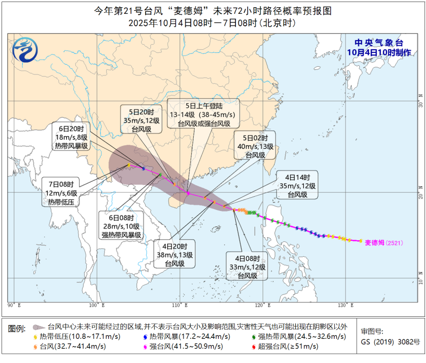 大風預報:4日14時至5日14時,巴士海峽、南海北部和中部海域、東沙羣島、西沙羣島、中沙羣島及黃巖島附近海域、北部灣、瓊州海峽、廣西沿海、廣東西南部及沿海、海南島及沿海、台灣島南部沿海有5-7級、陣風8-10級的大風,其中,南海西北部海域、瓊州海峽、北部灣東部海域、廣東西部沿海、海南島東部和北部沿海的風力有8-11級,陣風12-13級,“麥德姆”中心經過的附近海域或地區風力可達12-14級,陣風15-16級。