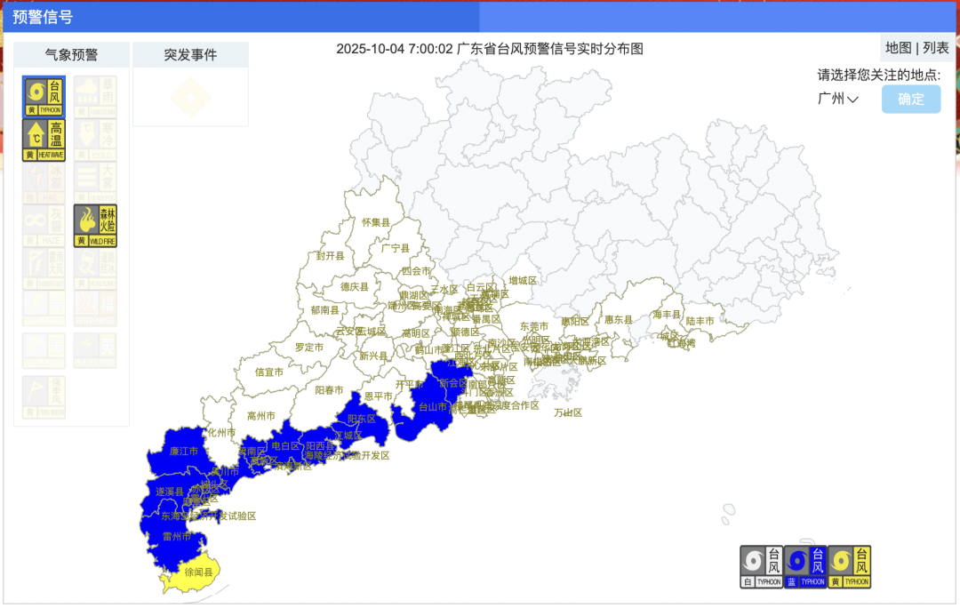截至10月4日8時,廣東徐聞維持發佈颱風黃色預警信號,湛江其他區域維持發佈颱風藍色預警信號;茂名、陽江、江門等地,有市縣區發佈颱風藍色預警信號;雲浮、肇慶、佛山、中山、珠海、廣州、東莞、深圳、惠州、汕尾等地,有市縣區發佈颱風白色預警信號。