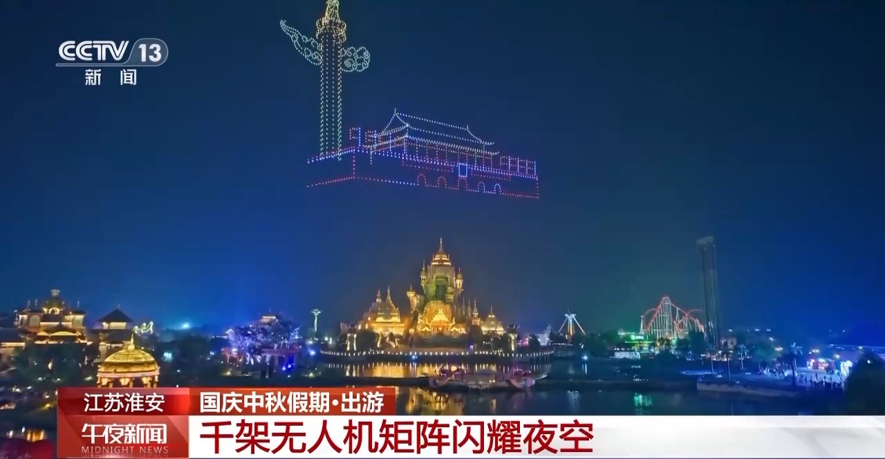 夜幕降臨,在江蘇淮安西遊樂園,1600架無人機同步升空,組成“我愛你中國”、天安門、璀璨中國等造型圖案,科技與光影的碰撞,譜寫了一曲璀璨奪目的 “空中詩篇”。全新升級的“國慶煙花大會”更是將現場氛圍推向高潮。絢爛的煙花與水幕交織相映,形成了一幅立體畫卷,營造出了既浪漫又熱烈的節日氛圍。