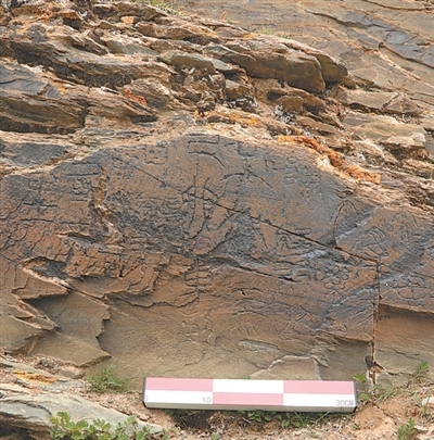 考古工作者在青海省扎陵湖畔拍攝的尕日塘秦刻石照片。