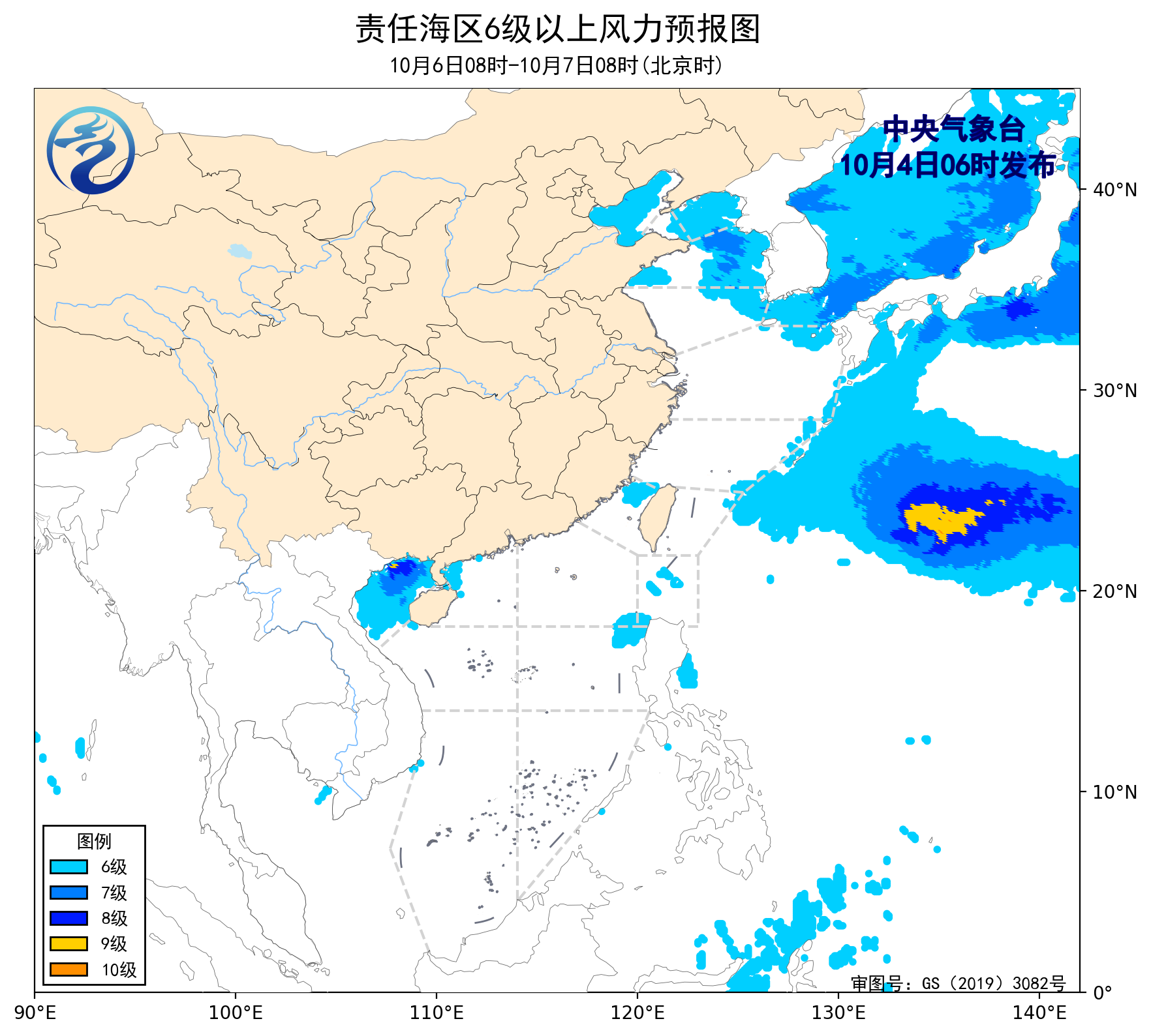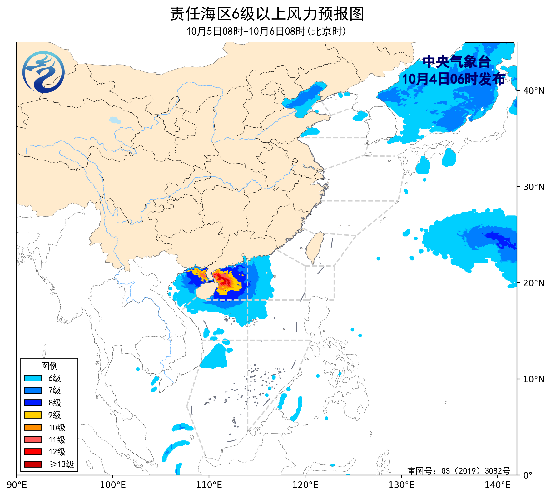 4日08時至5日08時,南海西北部海域將有10~11級、陣風12級的偏北風增大到12~13級、陣風14級的偏南風,南海東北部海域將有11~12級、陣風13級的偏南風,南海中東部海域將有10~11級、陣風12級的西南風減弱到8~9級、陣風10級的偏南風,瓊州海峽將有4級以下的偏西風增大到8~9級、陣風10級的西北風,南海中西部海域將有7~9級、陣風10級的偏西到西南風,北部灣將有4級以下的偏東風增大到6~7級、陣風8級的西北風,渤海將有4級以下的西南風增大到5~6級、陣風7級的東北風,南海西南部海域將有4~6級、陣風7級的西南風,東海南部海域、台灣海峽、巴士海峽將有4~6級、陣風7級的偏南到東南風。