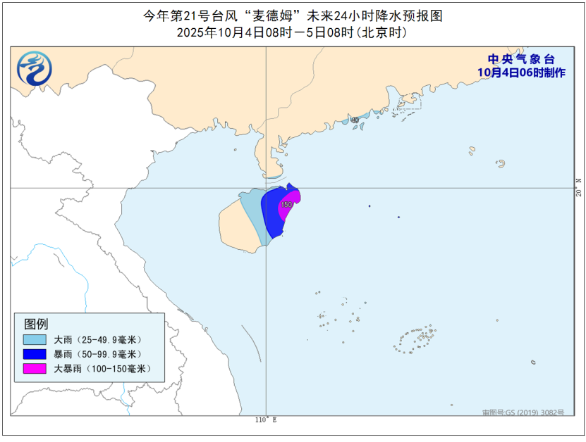 大風預報:4日08時至5日08時,巴士海峽、南海北部和中部海域、東沙羣島、西沙羣島、中沙羣島及黃巖島附近海域、北部灣中東部、瓊州海峽、廣西沿海、廣東西南部及沿海、海南島及沿海、台灣島南部沿海有5-7級、陣風8-10級的大風,其中,南海西北部海域、瓊州海峽、廣東西部沿海、海南島東部和北部沿海的風力有8-11級,陣風12-13級,“麥德姆”中心經過的附近海域或地區風力可達12-14級,陣風15-16級。