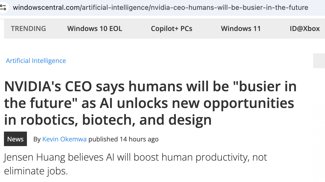 【環球網科技綜合報道】10月4日消息,據外媒windowscentral報道,針對生成式人工智能(AI)可能引發大規模失業的擔憂,NVIDIA首席執行官黃仁勳本週再度發聲,強調AI“不會取代人類,而是讓人類更忙碌”。他預計,機器人、生物技術與設計等前沿行業將在AI推動下誕生大量新崗位,人類創造力與判斷力反而比以往任何時候都更不可或缺。