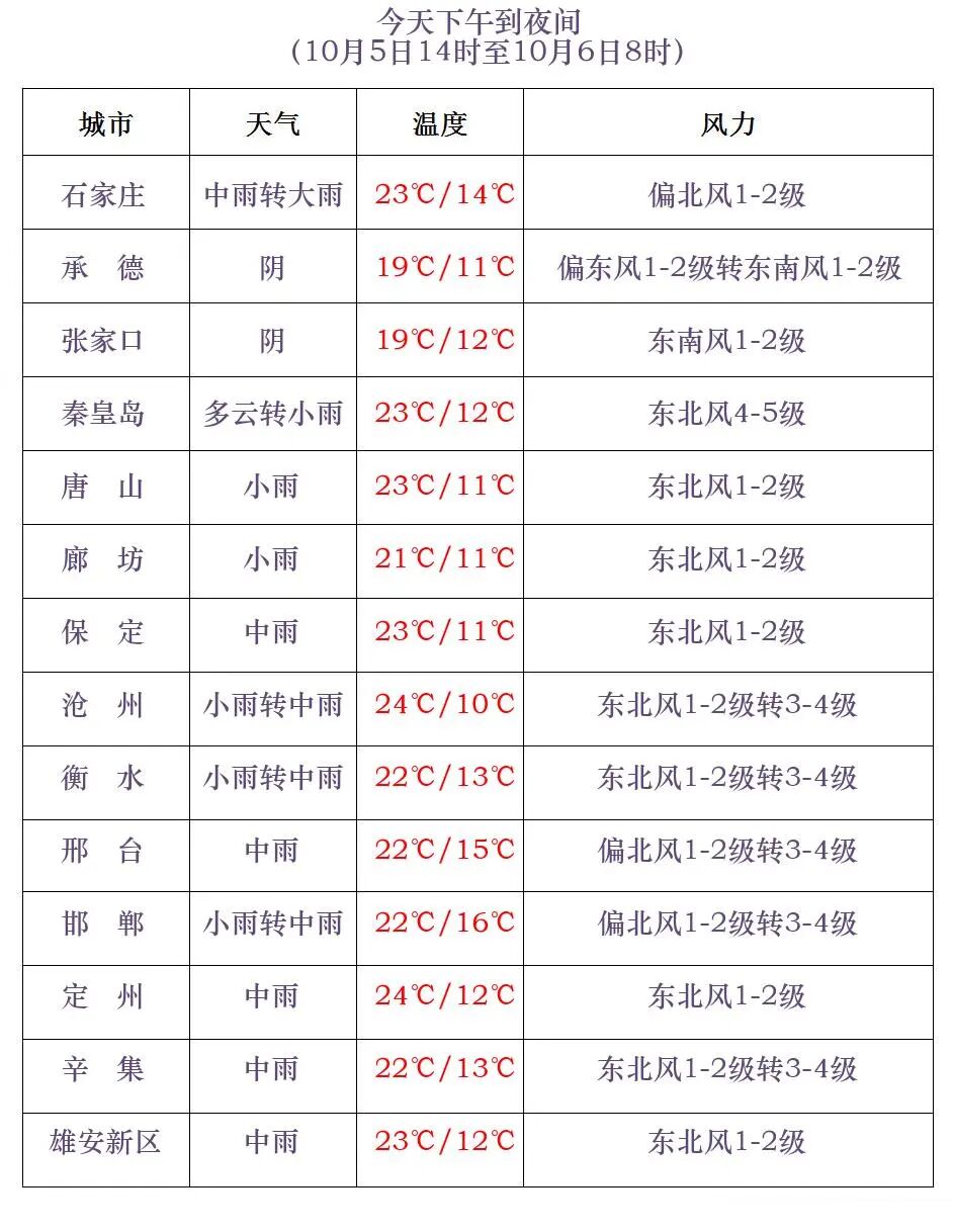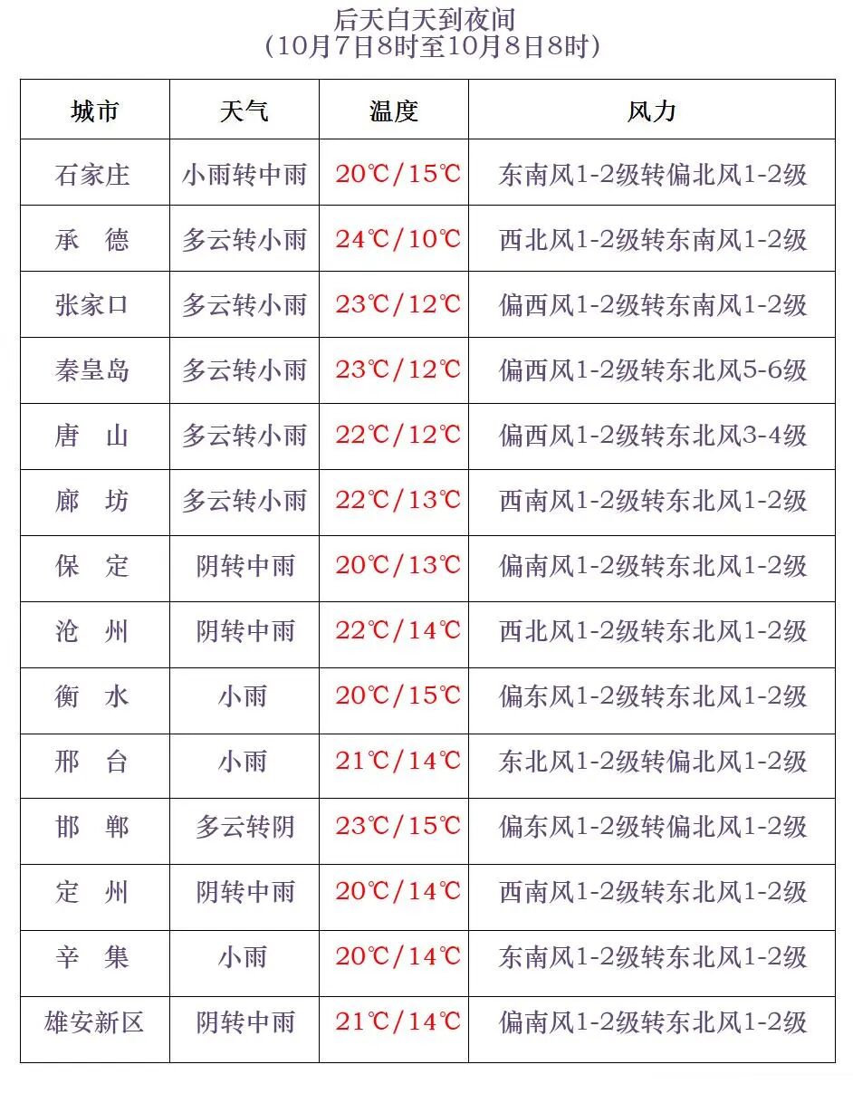 今天下午到夜間,全省陰,張家口、承德南部、唐山、秦皇島有小雨;保定、廊坊及以南地區有中到大雨,個別地點有暴雨。