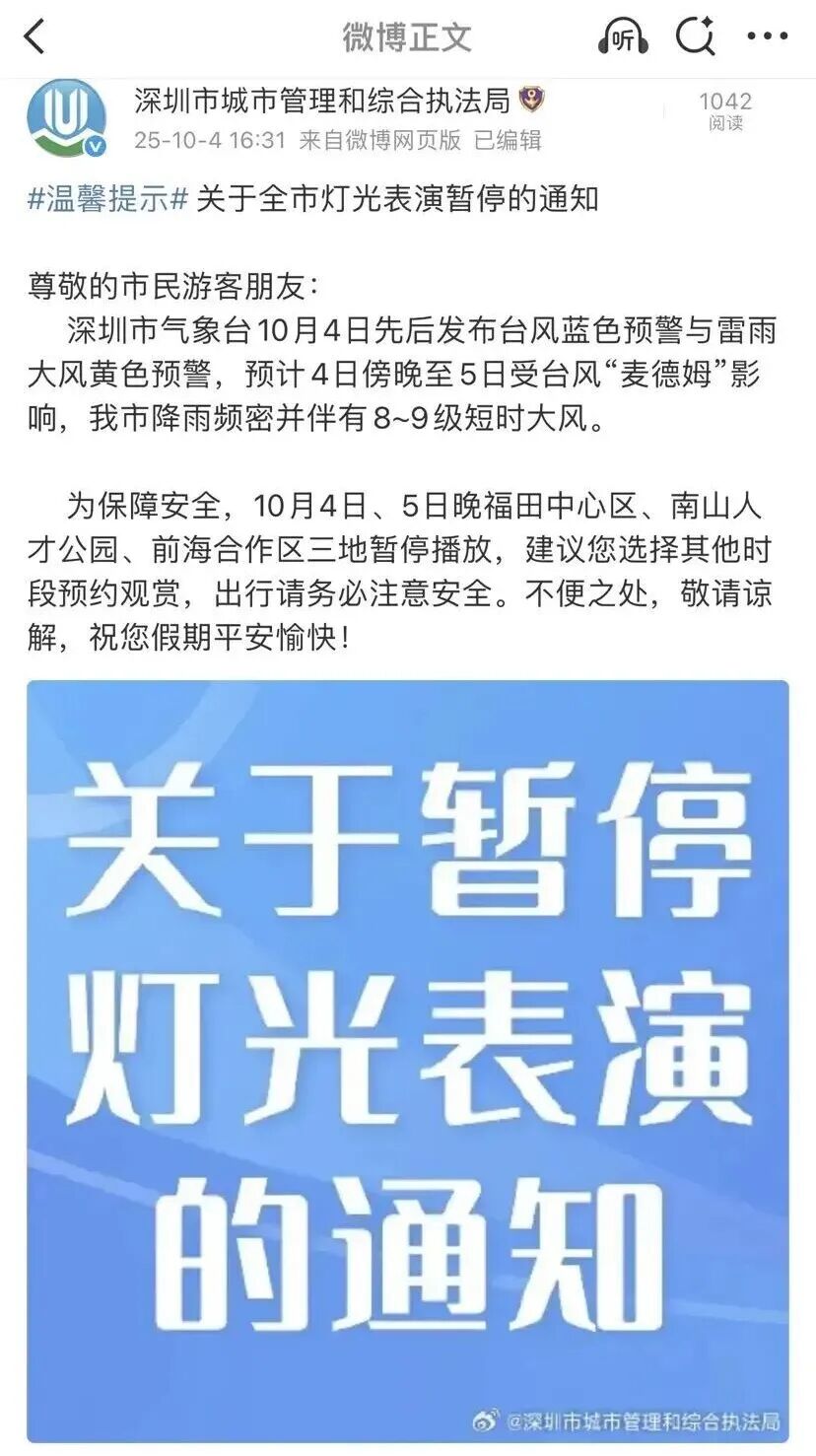 10月4日下午,深圳市城市管理和綜合執法局發佈全市燈光表演暫停通知。