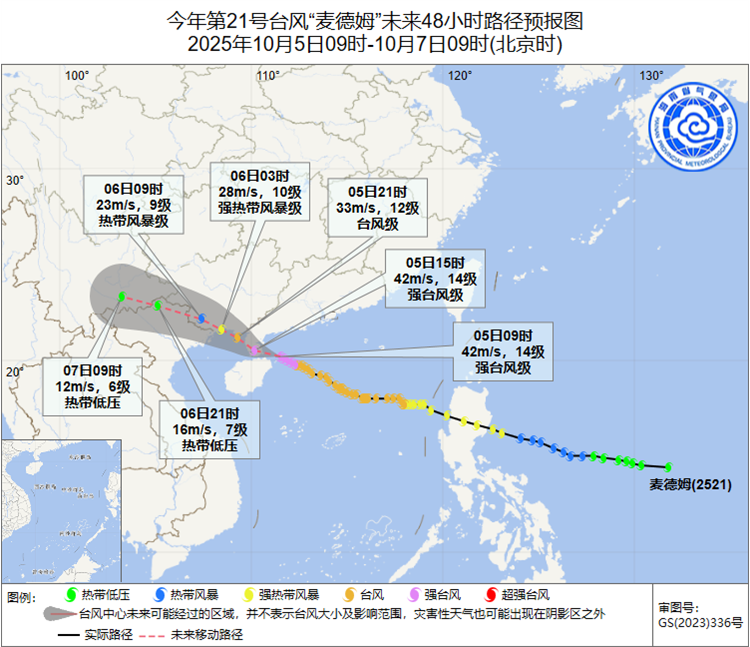 預計,“麥德姆”將以每小時25~30公里的速度向西偏北方向移動*,正在從文昌近海擦過(強颱風級,14級,42~45米/秒),於中午前後在廣東徐聞一帶沿海登陸* ,並將於今天傍晚到夜間進入北部灣北部海面,強度逐漸減弱。