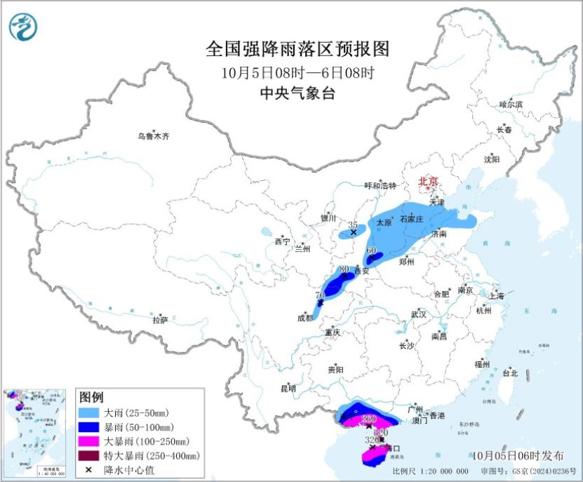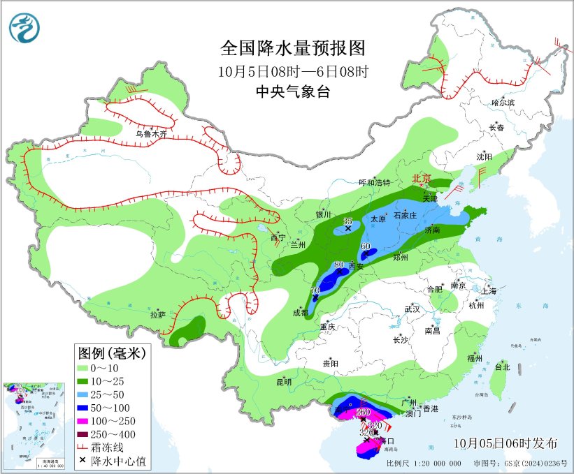 *10月5日08時至6日08時,*西北地區東部、華北中西部和南部、黃淮東部、四川盆地北部、華南南部和海南島等地部分地區有大到暴雨,其中,廣西南部、廣東西南部、海南島大部等地部分地區有大暴雨,廣西東南部沿海、廣東西南部沿海、海南島北部等地局地特大暴雨(250~320毫米)。內蒙古東北部、黑龍江東北部、遼東半島、青海東部等地部分地區有4~6級風,新疆北部、廣西東南部等地部分地區有6~7級風,海南島東北部部分地區有8~9級風(見圖4)。