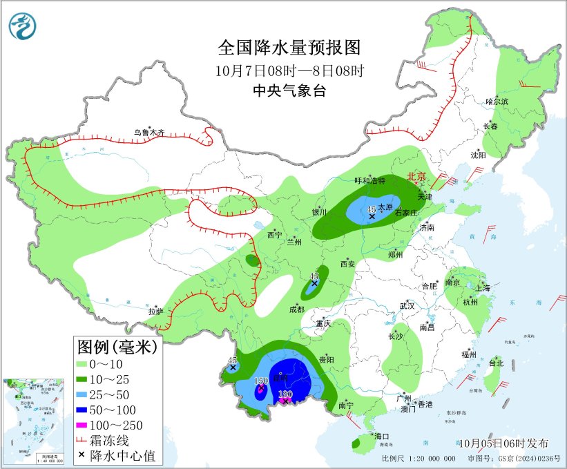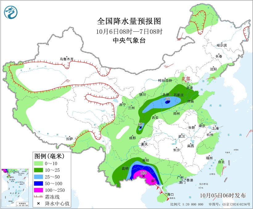 *10月6日08時至7日08時,*西北地區東部、華北中西部和南部、黃淮東部、四川盆地北部、西南地區南部、華南西部等地部分地區有中到大雨,其中,貴州西南部、雲南東南部、廣西西部等地部分地區有暴雨或大暴雨(100~180毫米)。內蒙古東北部和中部、遼東半島、新疆南疆盆地等地部分地區有4~6級風,廣西西南部、海南島東北部等地部分地區有7~8級風(見圖5)。