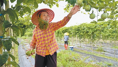 海南海口市,玉下村村民在採摘百香果。玉下村發展百香果、水稻、冬瓜等特色產業,讓村民實現家門口就業。