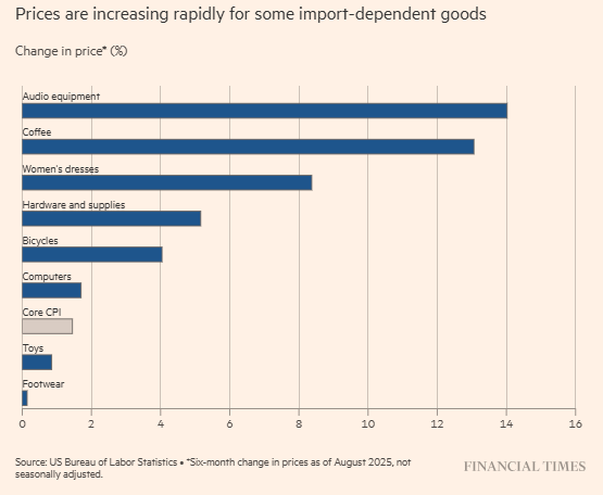 報道稱,官方數據和企業聲明顯示,在企業清空庫存並將關税成本轉嫁給消費者後,一系列依賴貿易的商品價格出現加速上漲。報道援引美國勞工統計局的數據指出,在截至8月的六個月時間內,音響設備價格上漲14%,女裝價格上漲8%,工具、五金用品上漲5%——這些商品大多依賴進口。
