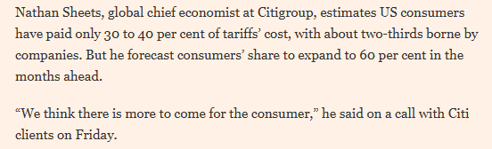 文章援引花旗集團全球首席經濟學家內森·希茨的觀點報道稱,目前美國消費者僅承擔了關税成本的30%至40%,約三分之二的關税成本由企業消化。但他預測,未來數月消費者的承擔比例將擴大至60%,“消費者還將面臨更多影響”。
