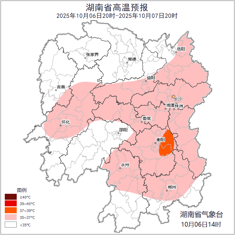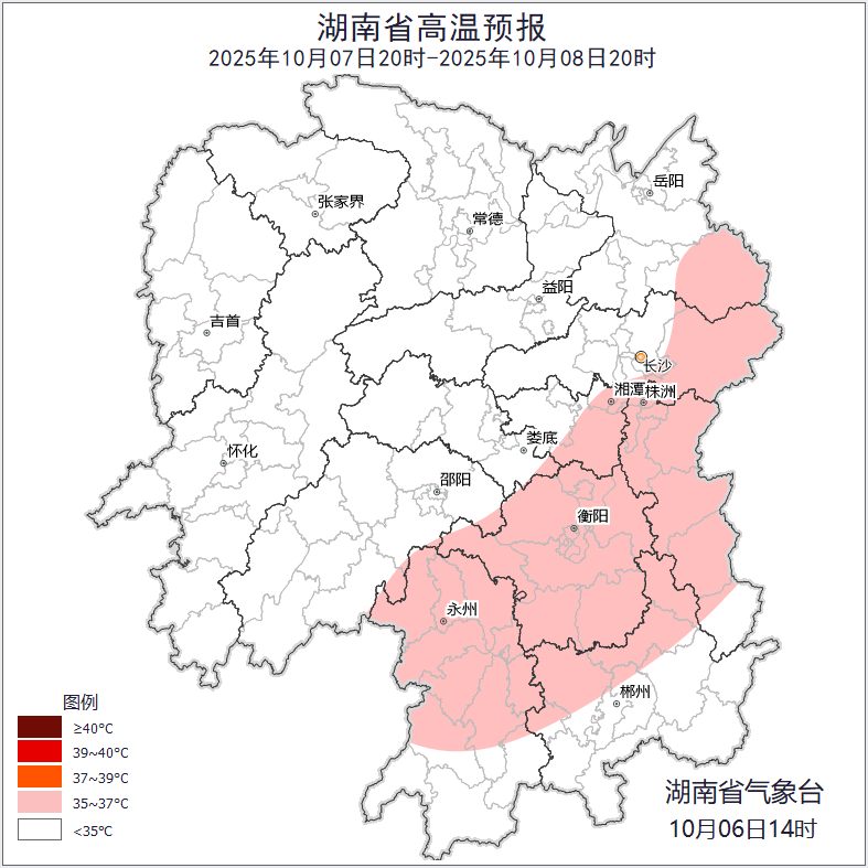 預計7日白天,長沙、株洲、湘潭、衡陽、岳陽、益陽南部、郴州北部、永州北部、懷化中北部、婁底將達到35℃以上高温,局部地區將達37℃以上,請做好防範。