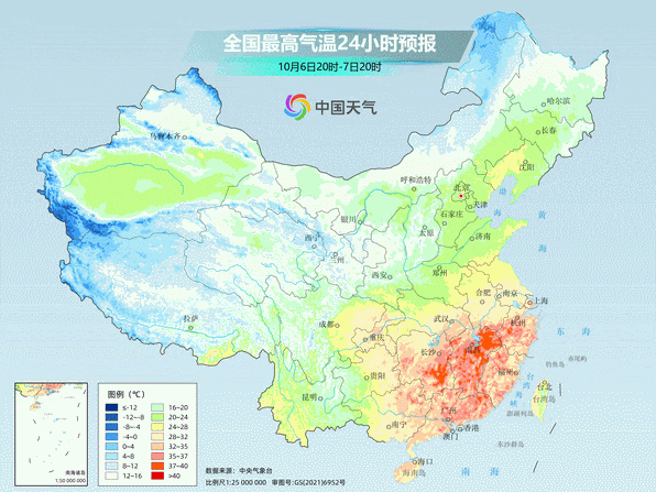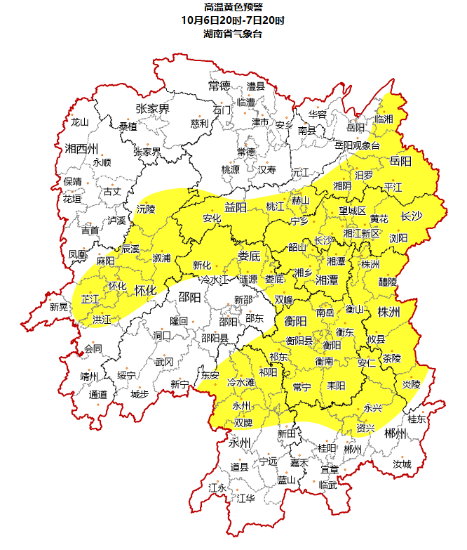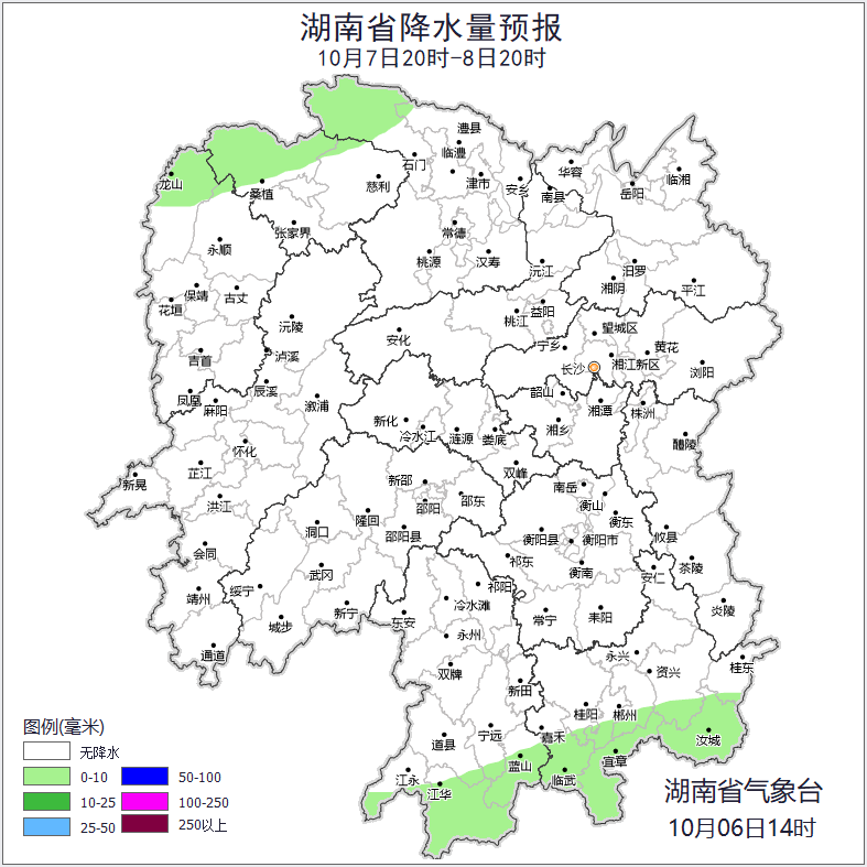 10月7日晚上至8日白天,全省晴天間多雲,湘南、湘西北局地有陣雨;8日清晨湘中、湘北局地有霧;南風2~3級;最高氣温湘西、湘北28~33℃,其他地區34~37℃,最低氣温21~25℃。