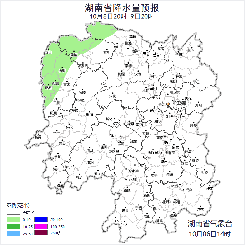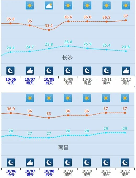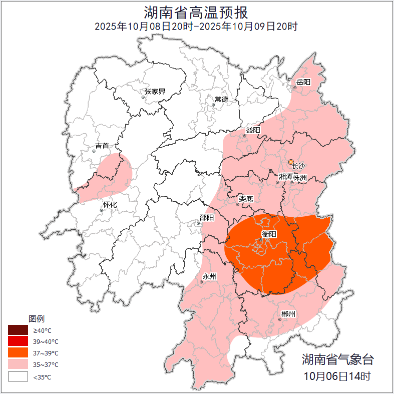 10月8日晚上至9日白天,全省晴天間多雲,湘西北局地有陣雨;南風2~3級;最高氣温湘東、湘南35~37℃,其他地區31~34℃,最低氣温21~25℃。
